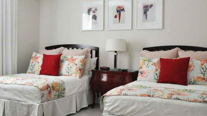 All beds are top-of-the-line Kingsdown pillow top mattresses. Bedding set up: 1 King bed in Master bedroom, 1 Queen bed in the 2nd bedroom, 1 King bed in the 3rd bedroom, 2 Double beds in the 4th bedroom. Each bedroom has a full bathroom, large Flat Screen TV and DVD player.