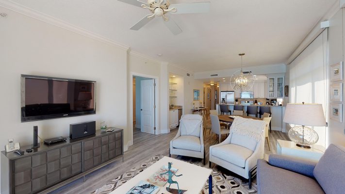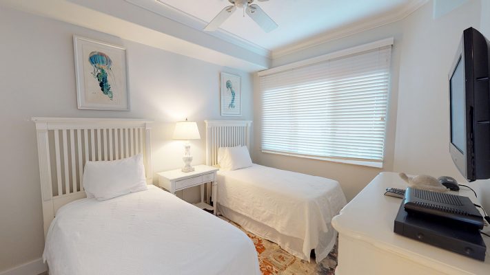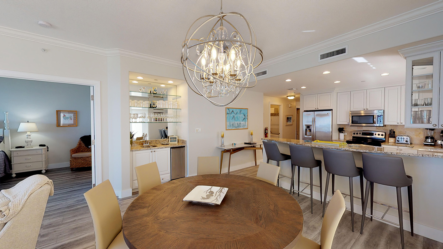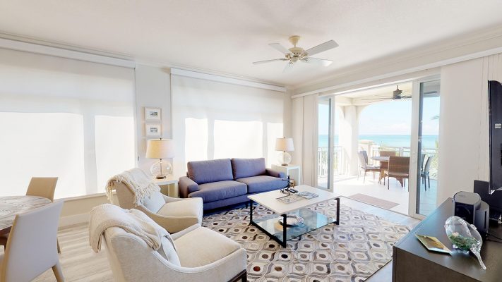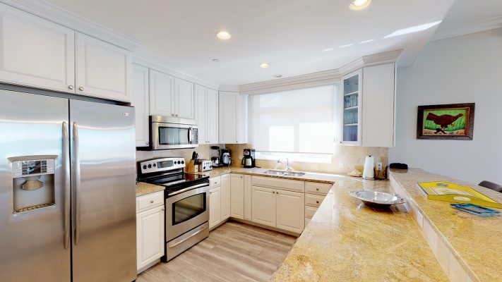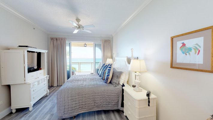 This luxurious 3Bed/3Bath is located on the outside corner of the 4th Floor. The large windows and high crown-molded ceilings give this light-filled villa expansive views of the beach / sea. Tiled floors, central A/C and ceiling fans on the patio and throughout the villa, keep guests cool and comfortable. A 47” LCD flat-screen TV/DVD is in the Living room, 32” TV/DVDs are located in each bedroom – entertainment and music channels. A wet bar with an additional ice-maker, has been added to the dining area, a real plus when blending cool tropical drinks!