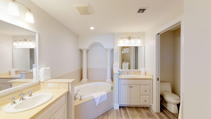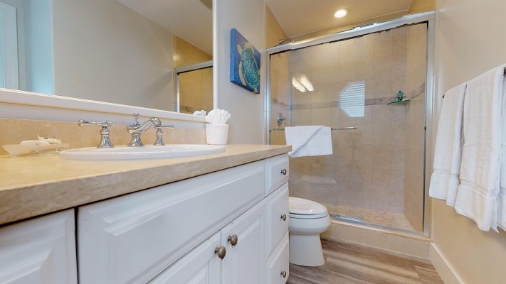 The bedding arrangement for Villa #18 is 1 King bed in the master bedroom, 1 Queen bed in the 2nd bedroom and 2 Twin beds in the 3rd bedroom. Upon request, the 2 Twin beds can be combined and made into a King bed. Each bedroom has a full bathroom, large Flat Screen TV and DVD player.