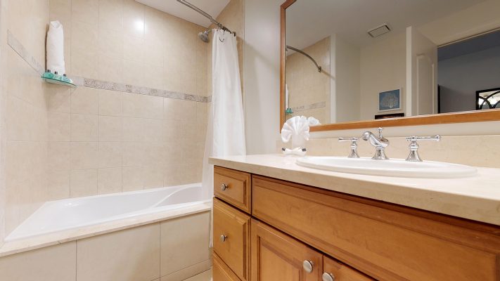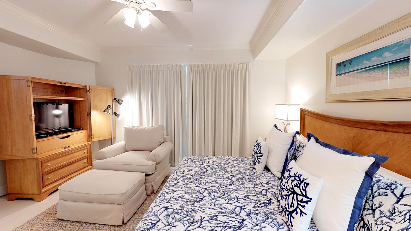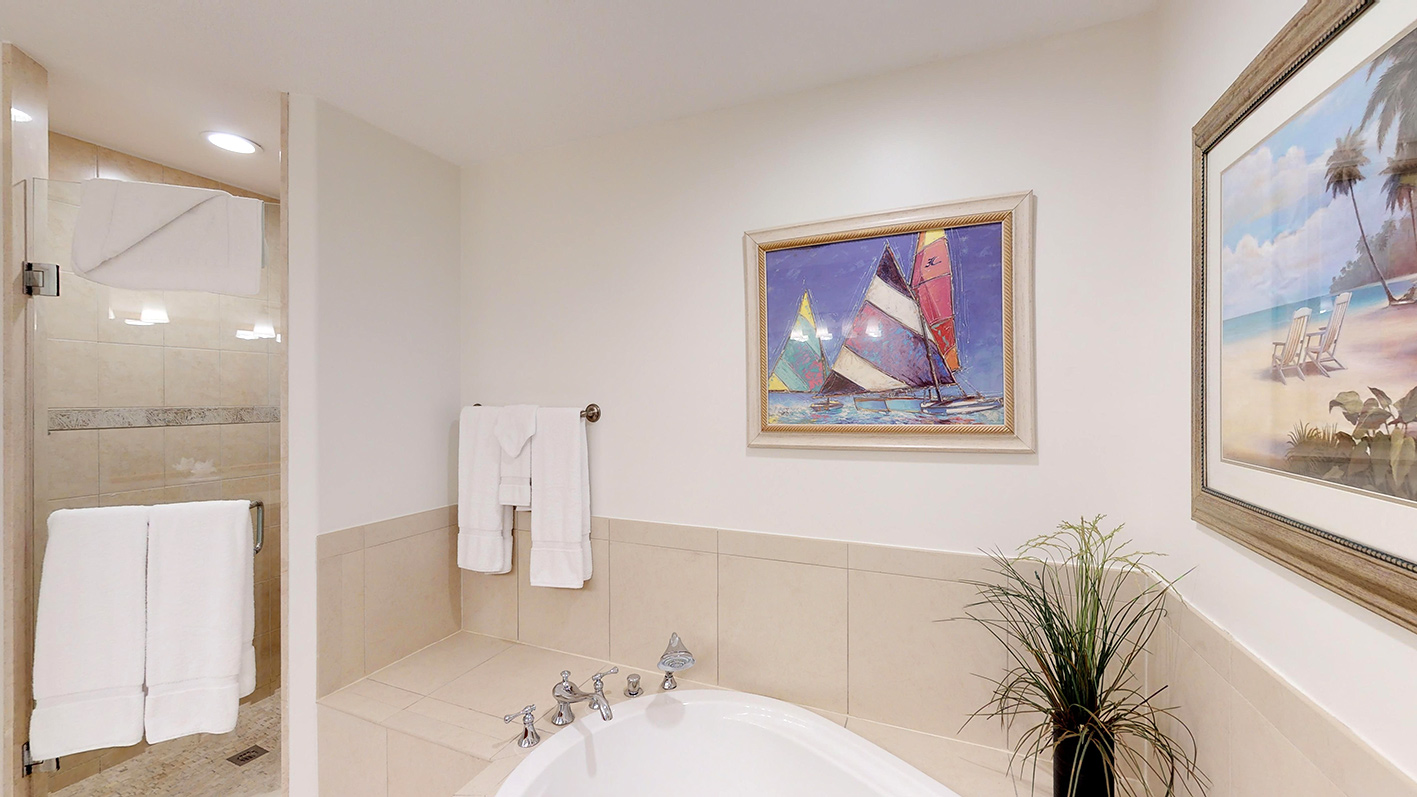 The bedding arrangement for Villa #33 is 1 King bed in the master bedroom and 1 King bed in the 2nd bedroom. Each bedroom has a full bathroom & large Flat Screen TV. The luxurious Master bedroom features an en-suite bathroom with platform soaker tub, large separate walk in shower, water closet and 2 vanities. Hair dryers, towels, linens, bath robes and complimentary Gilchrist & Soames bathing soaps and lotions are also included.