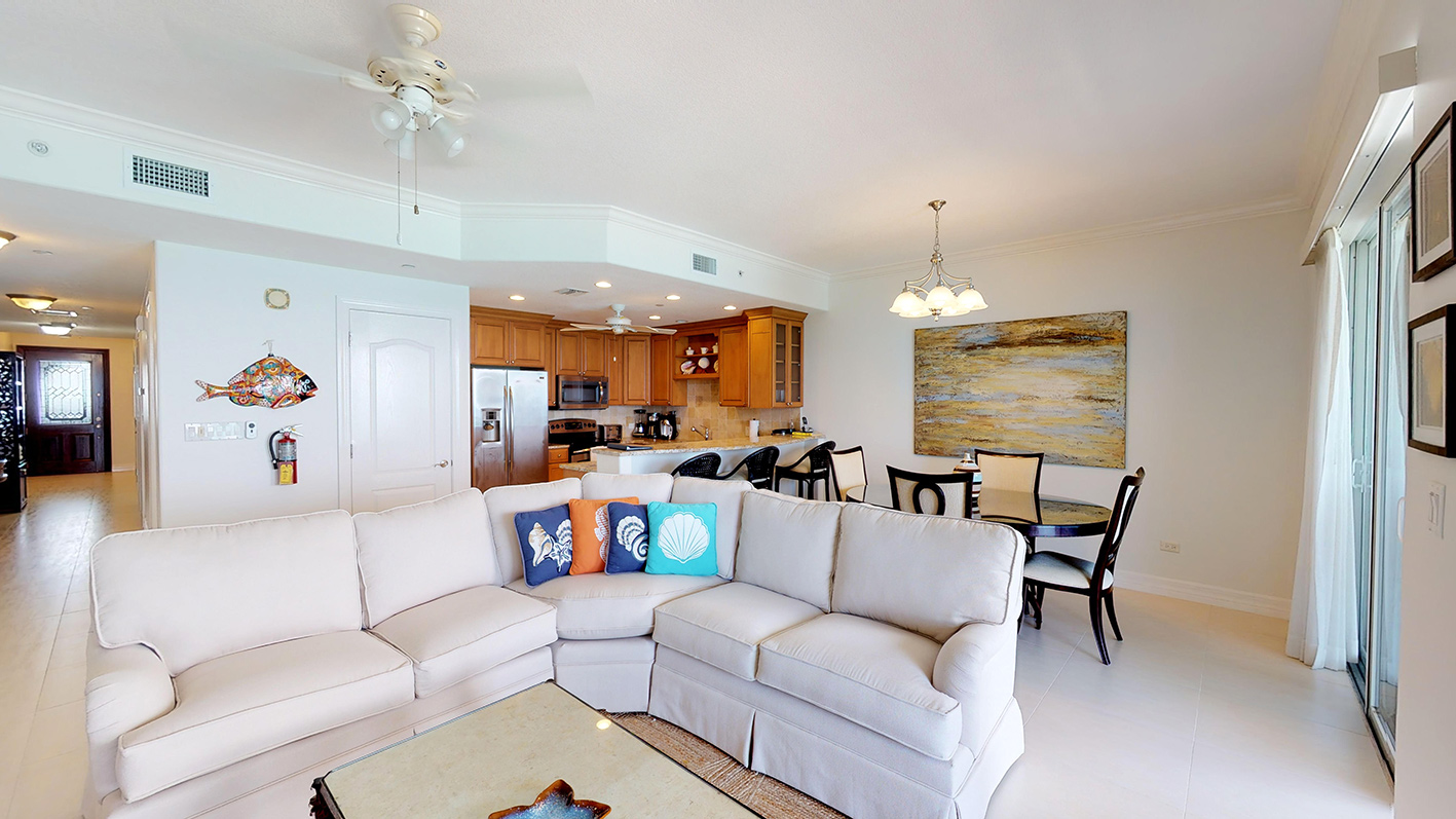 This 1800 sq. ft. designer decorated villa offers breath-taking views of Seven Mile Beach and the turquoise Sea from the kitchen, dining room and living room. The spacious patio is the perfect place for casual dining and sunsets with ceiling fans to keep the tropic breeze flowing. Central A/C, Hunter ceiling fans and tiled floors throughout, keep this lovely villa cool and comfortable. Large flat screen TVs/DVDs are located in the living room and both bedrooms, and come equipped with cable entertainment channels and 40 music channels to choose from.