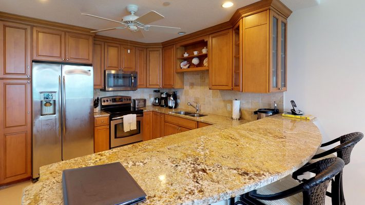 A fully equipped, high-end, gourmet kitchen with granite counter tops and stainless steel appliances awaits our guests, making meal planning simple and easy.