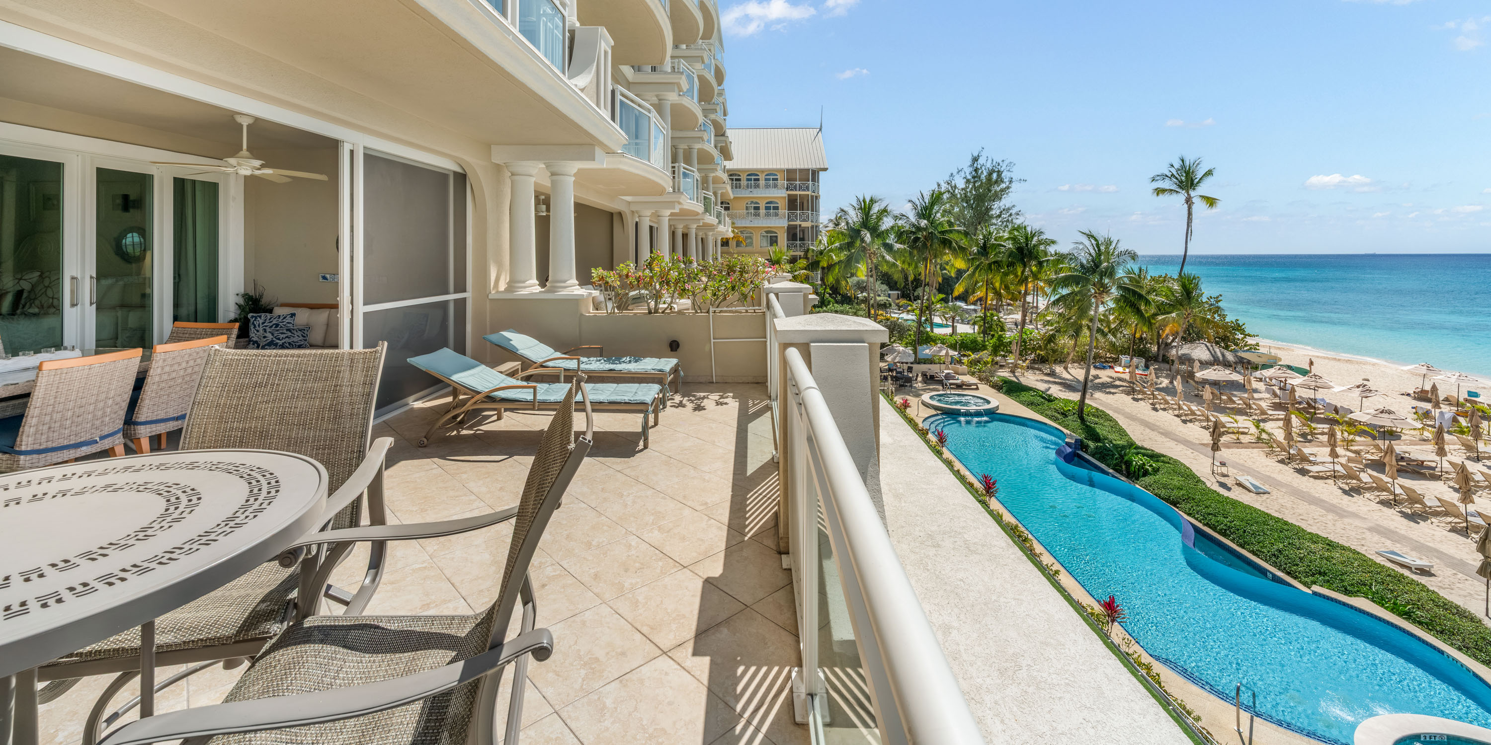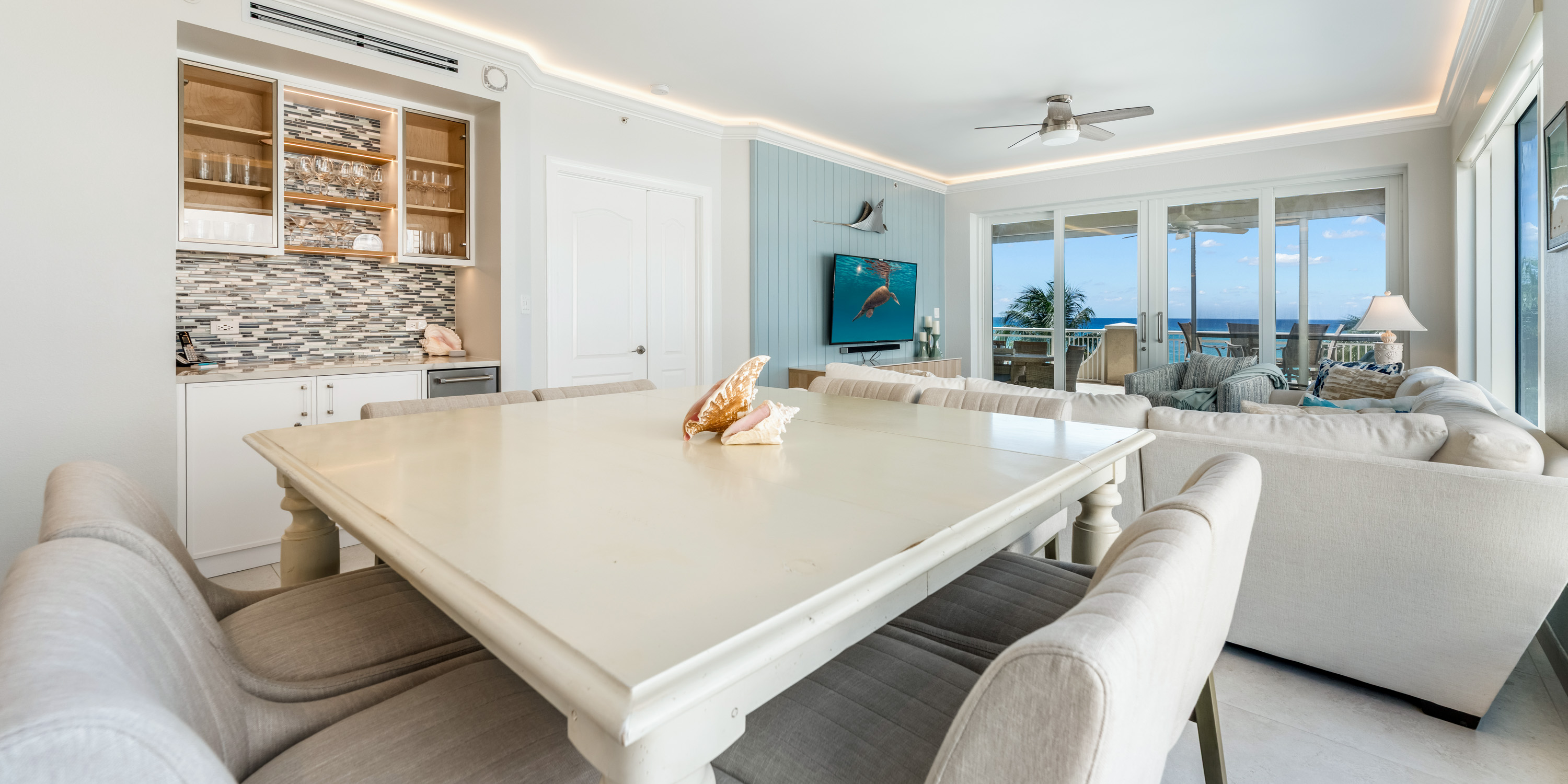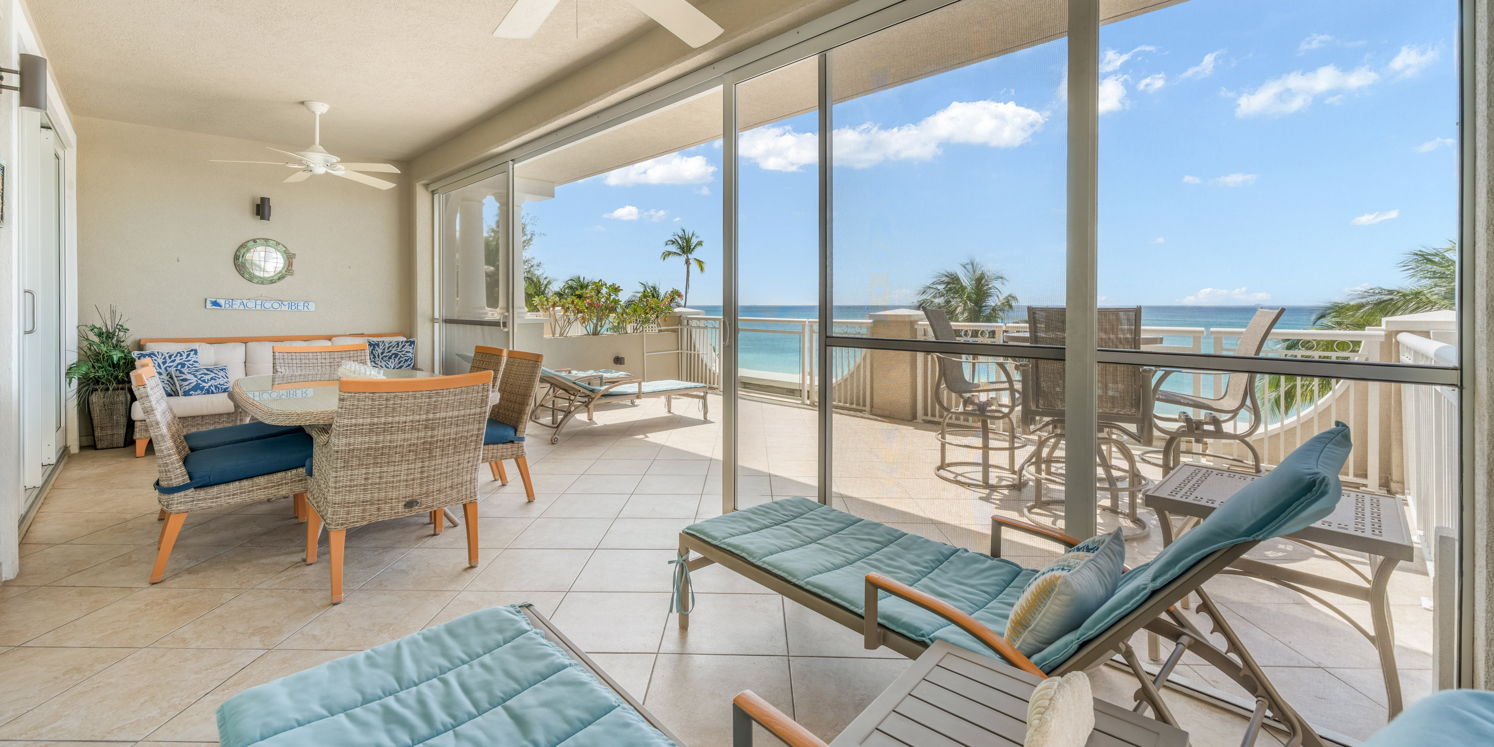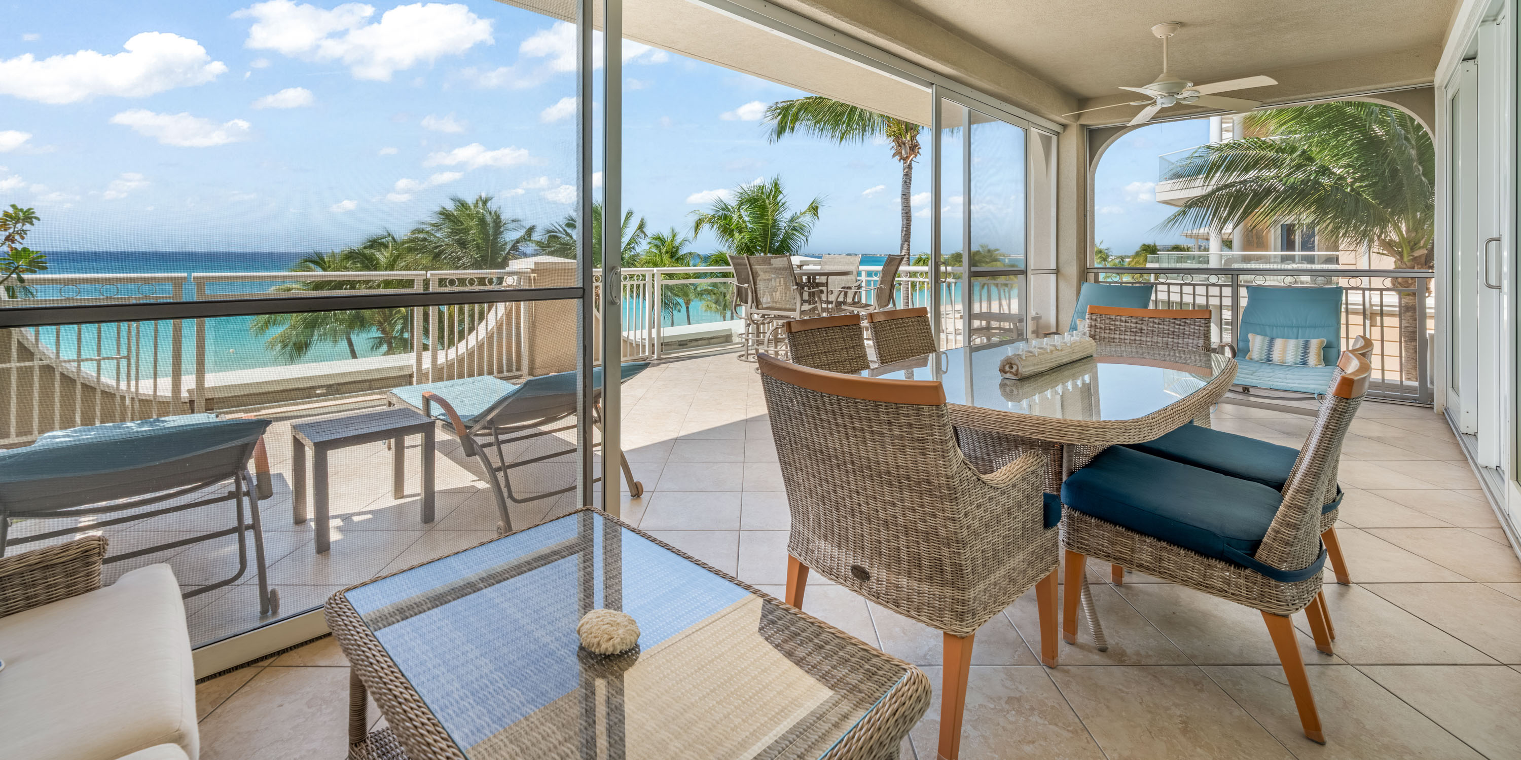 The corner unit balcony has both a screened-in section with a comfortable dining table for six, and a separate sun deck for lounging with a bar height table for sunset happy hours.