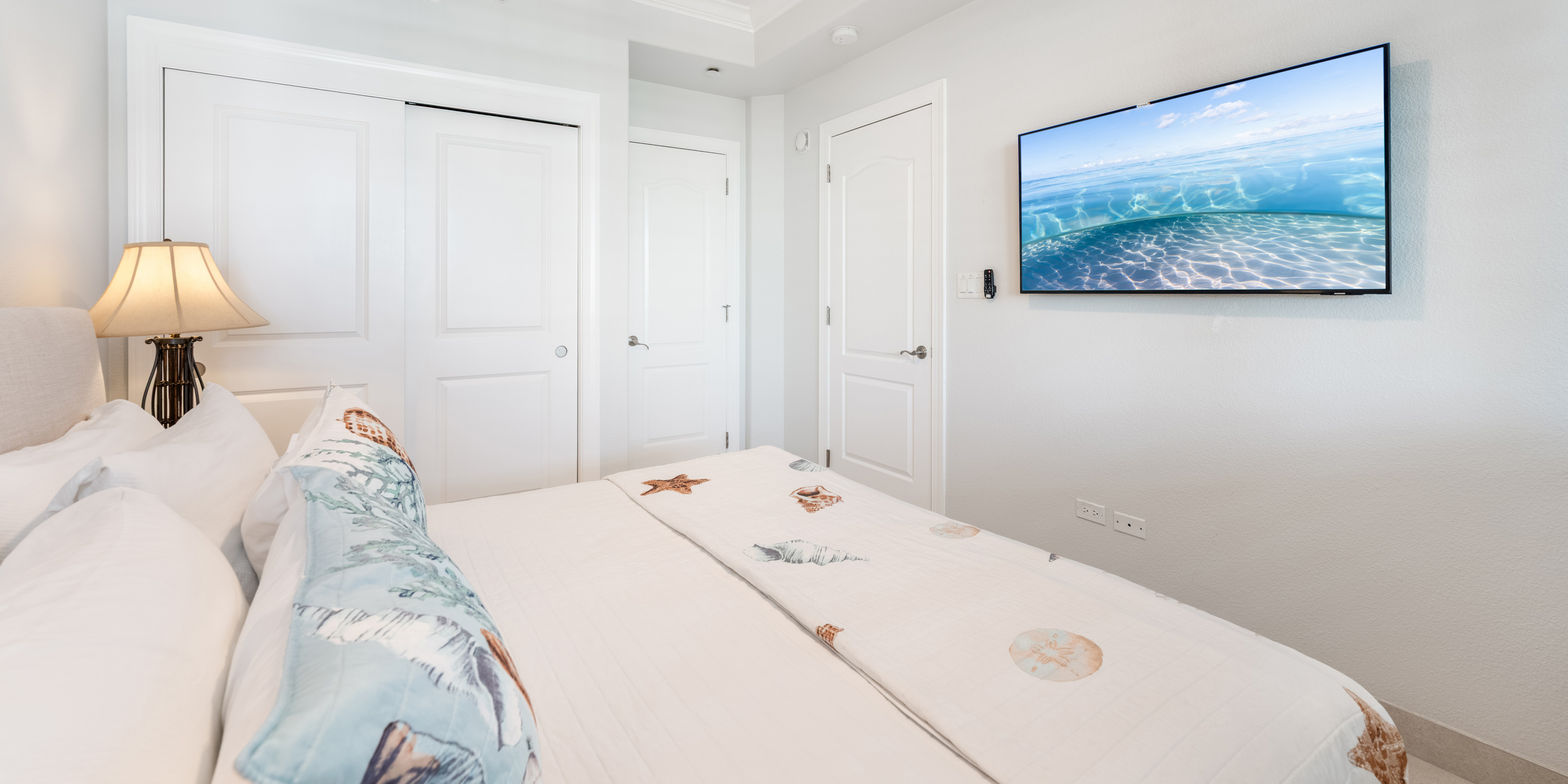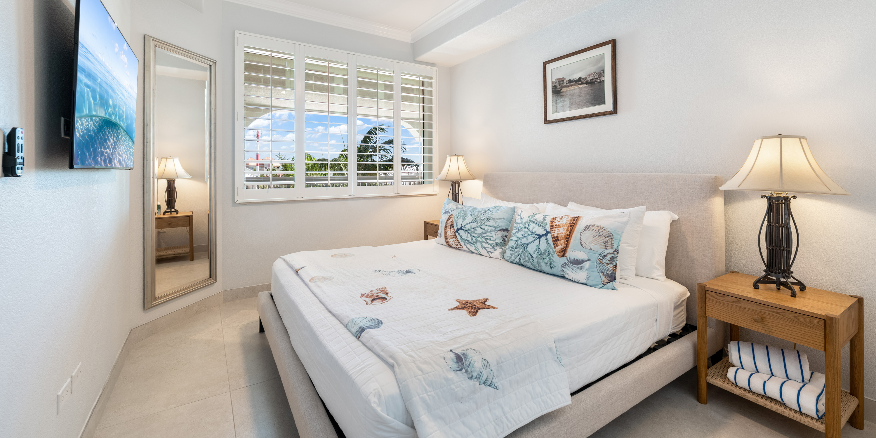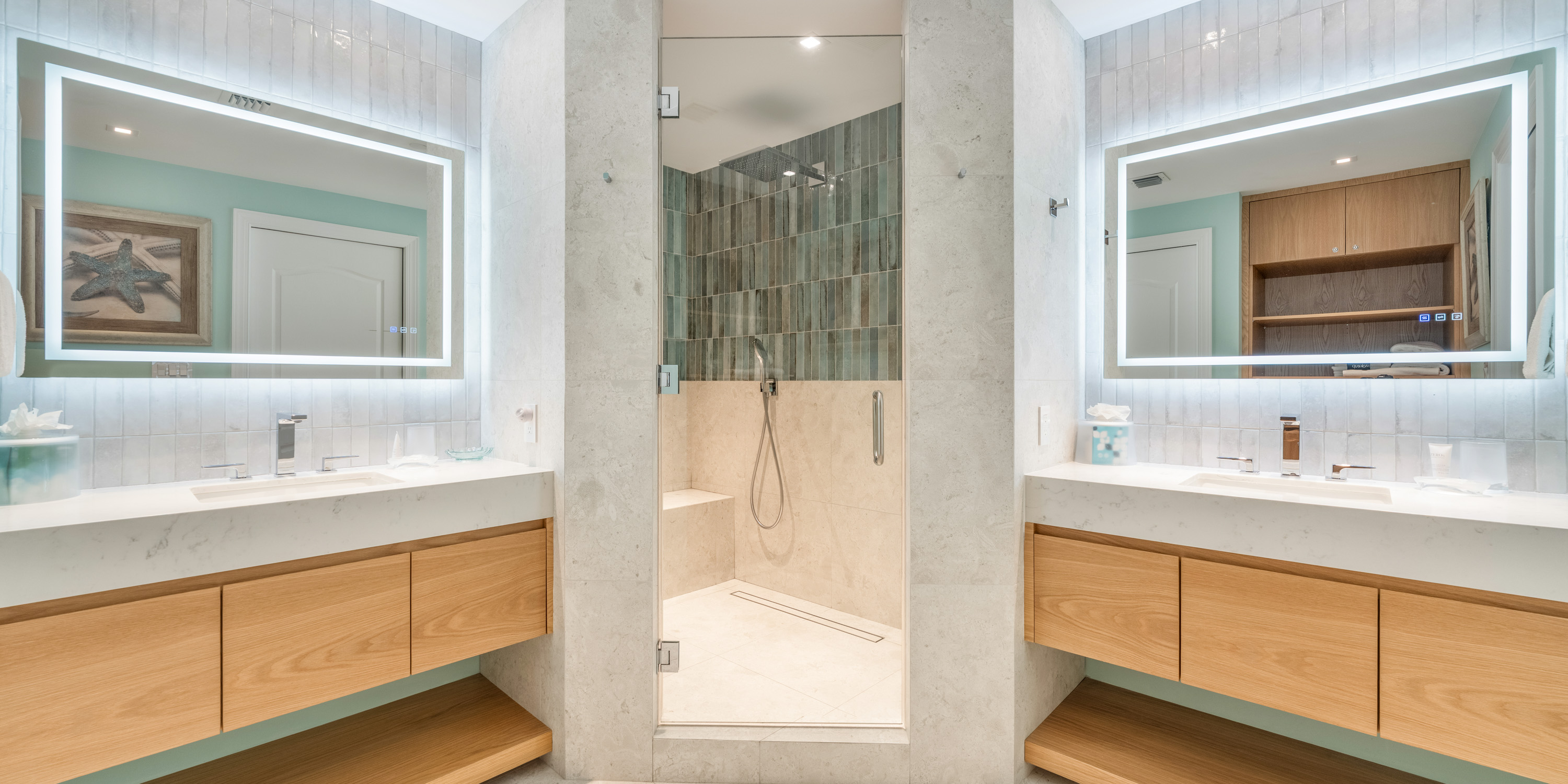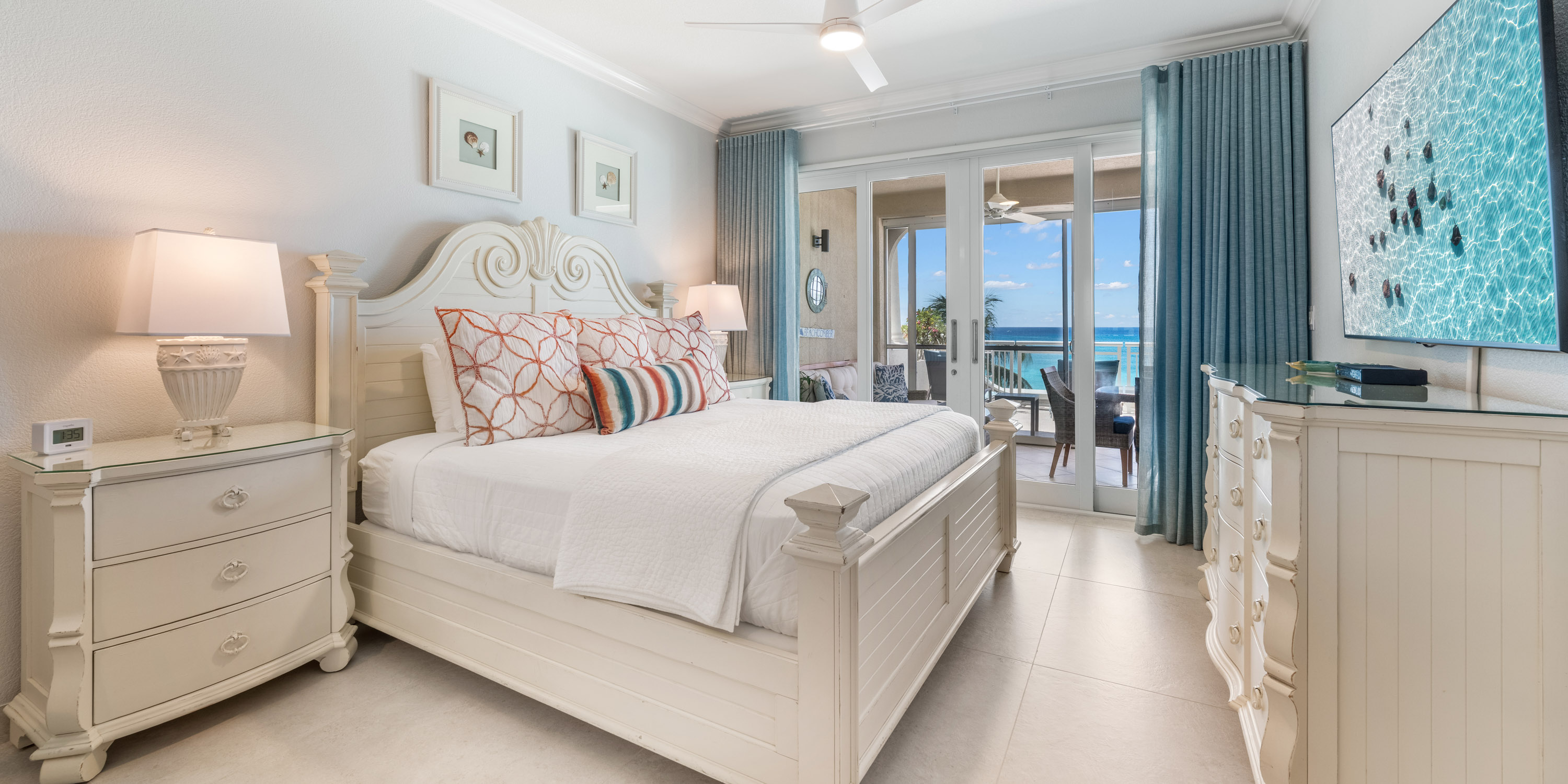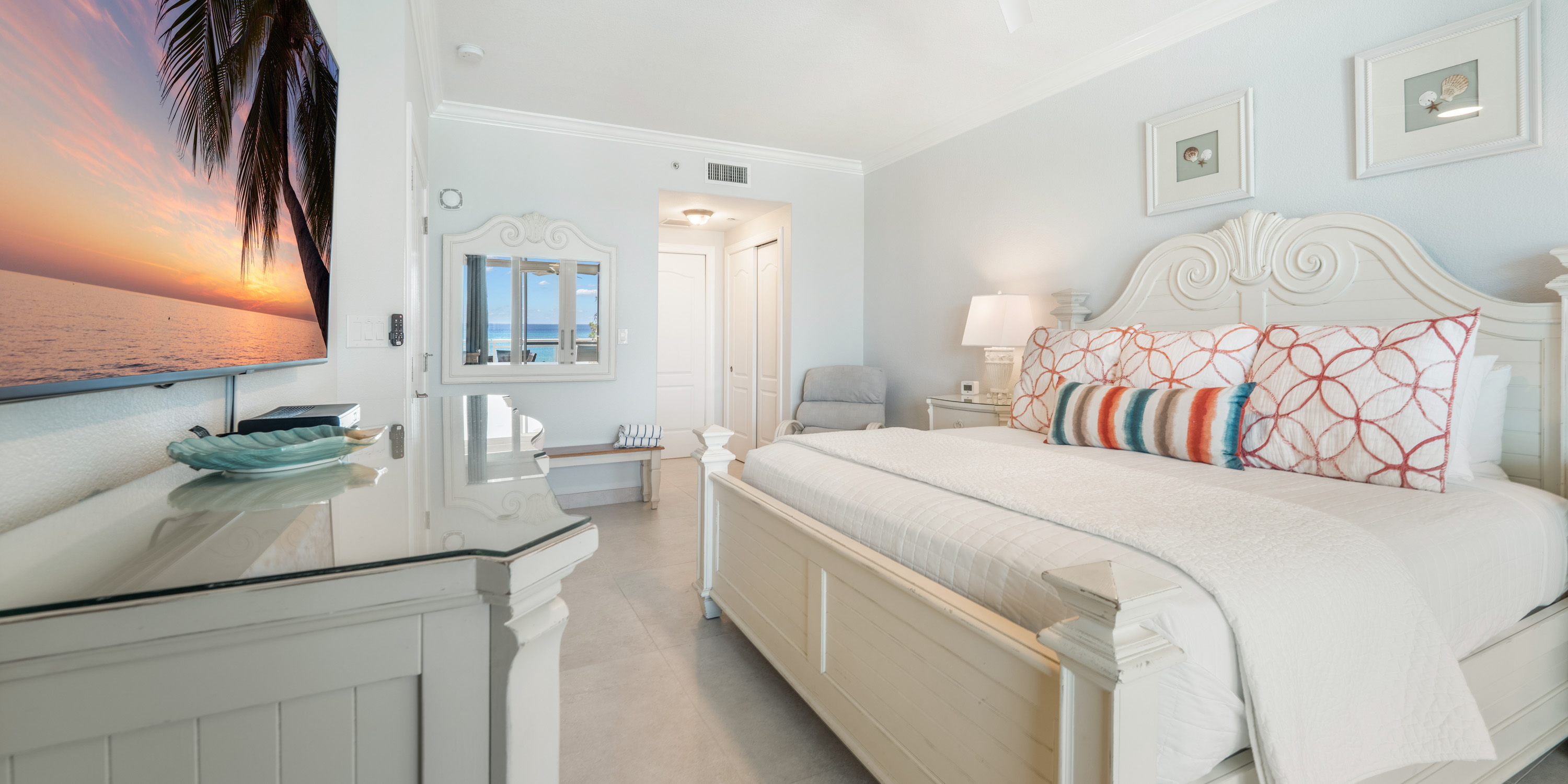 - Primary Suite - king bed, oceanfront, walk-out access to the balcony, television, ensuite with newly remodeled double vanity, Hans Grohe rainfall shower with water wand and bench.