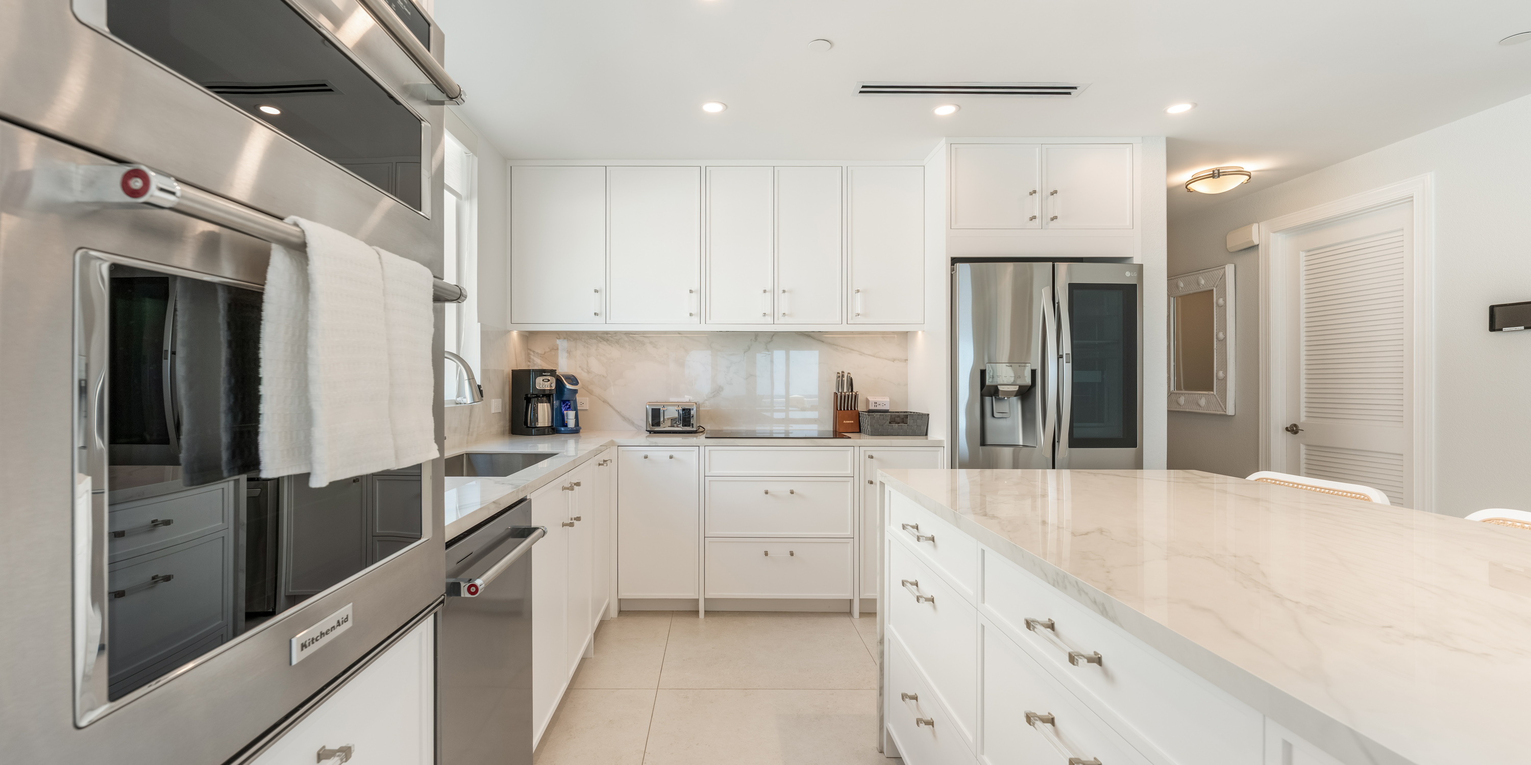 The designer kitchen features granite countertops, high-end appliances, and nice extras like an under-the-counter ice maker, coffee maker, single-serve Keurig coffee maker, and Bullet smoothie maker.
