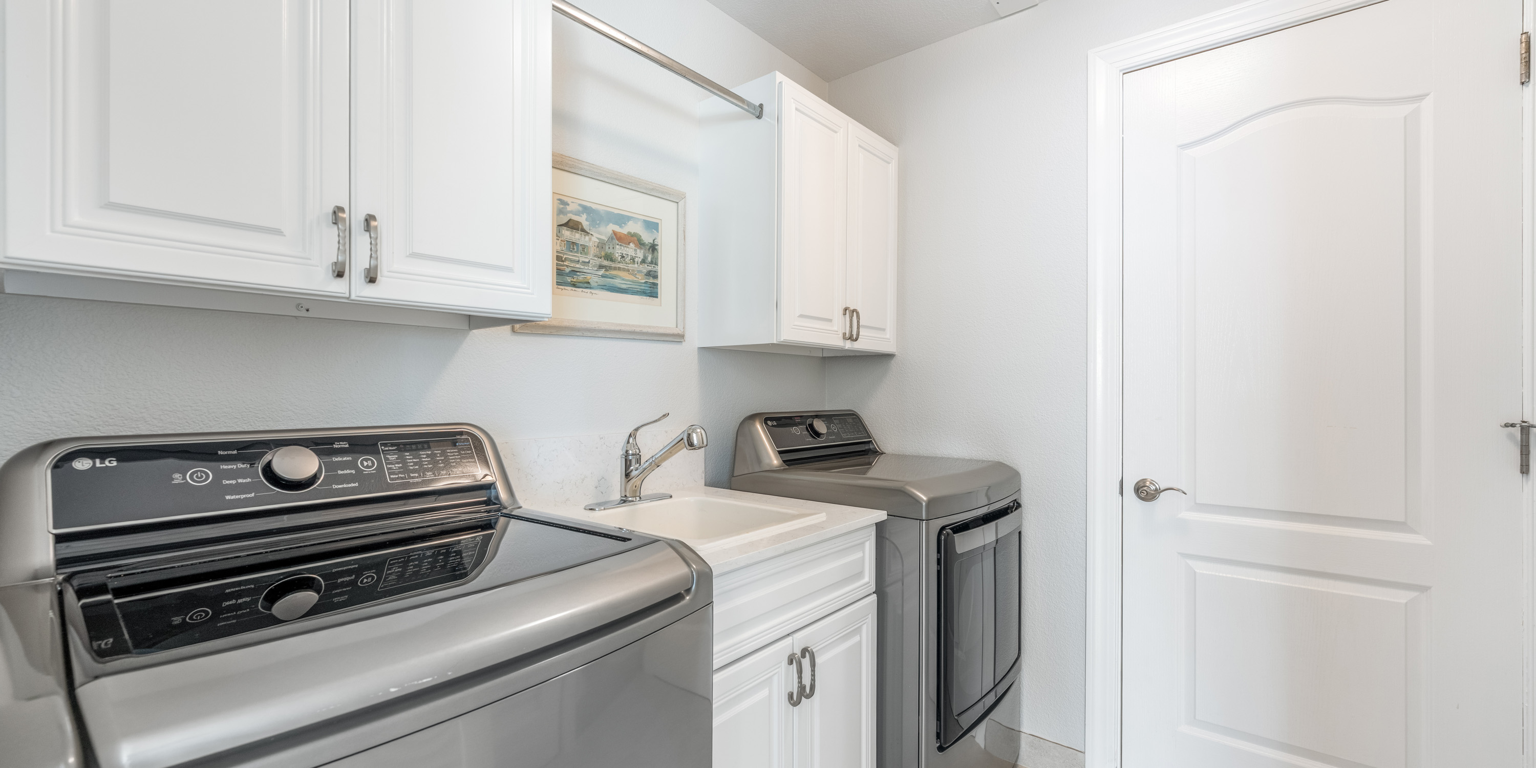 There is a full-sized washer and dryer, plus a utility sink in the laundry room. Pool floaties and snorkel gear are also stored in this room.