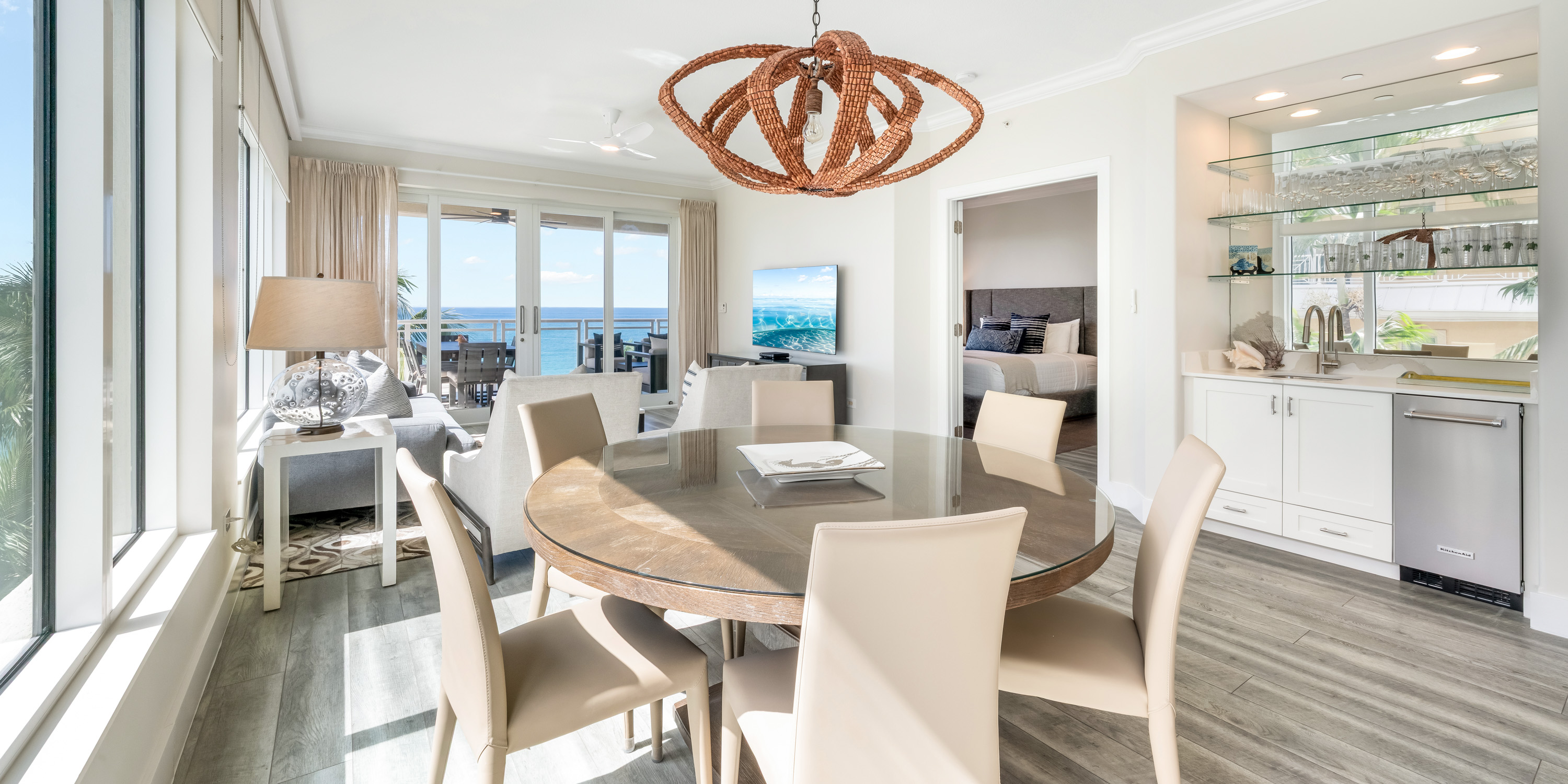 This luxurious 3-bed, 3-bath condo is located on the outside corner of the fourth floor. The large windows and high ceilings give this light-filled home expansive beachfront views.
