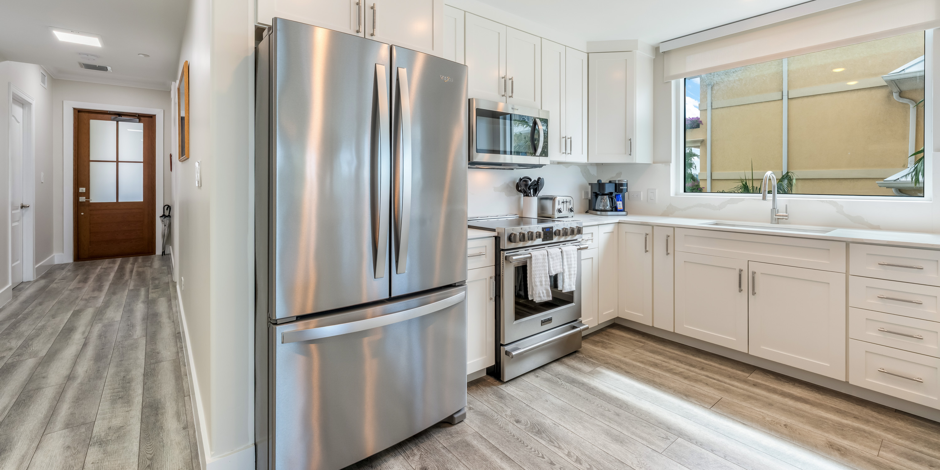 The gourmet kitchen has high-end stainless steel appliances including a Krups coffee maker, blender, toaster, single-serve coffee maker, and every cooking utensil needed for a home-cooked meal. A wet bar with an additional ice maker has been added to the dining area, a real plus when blending tropical drinks!