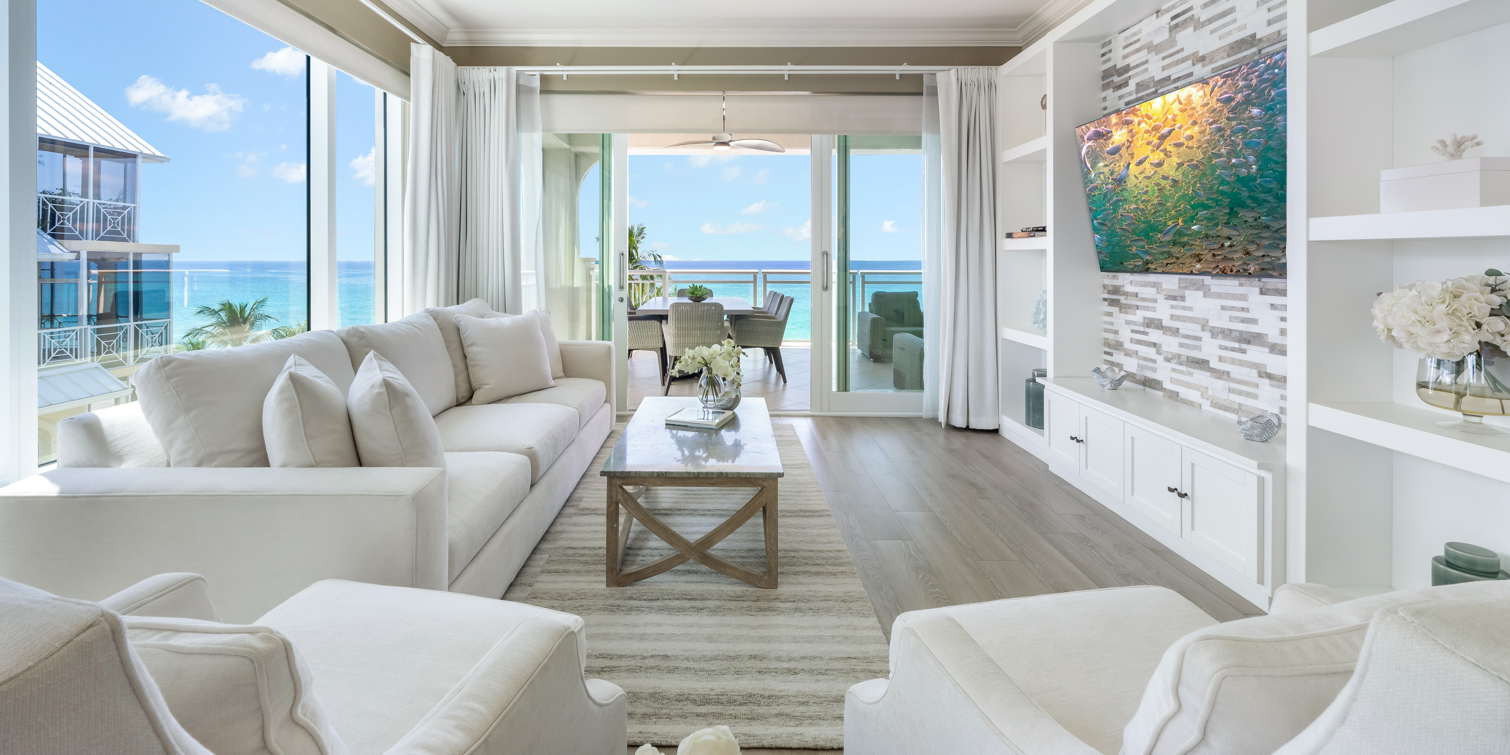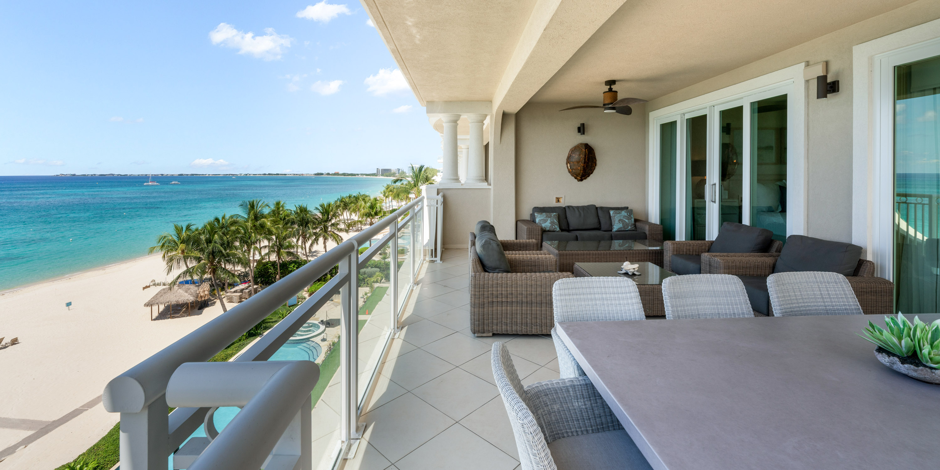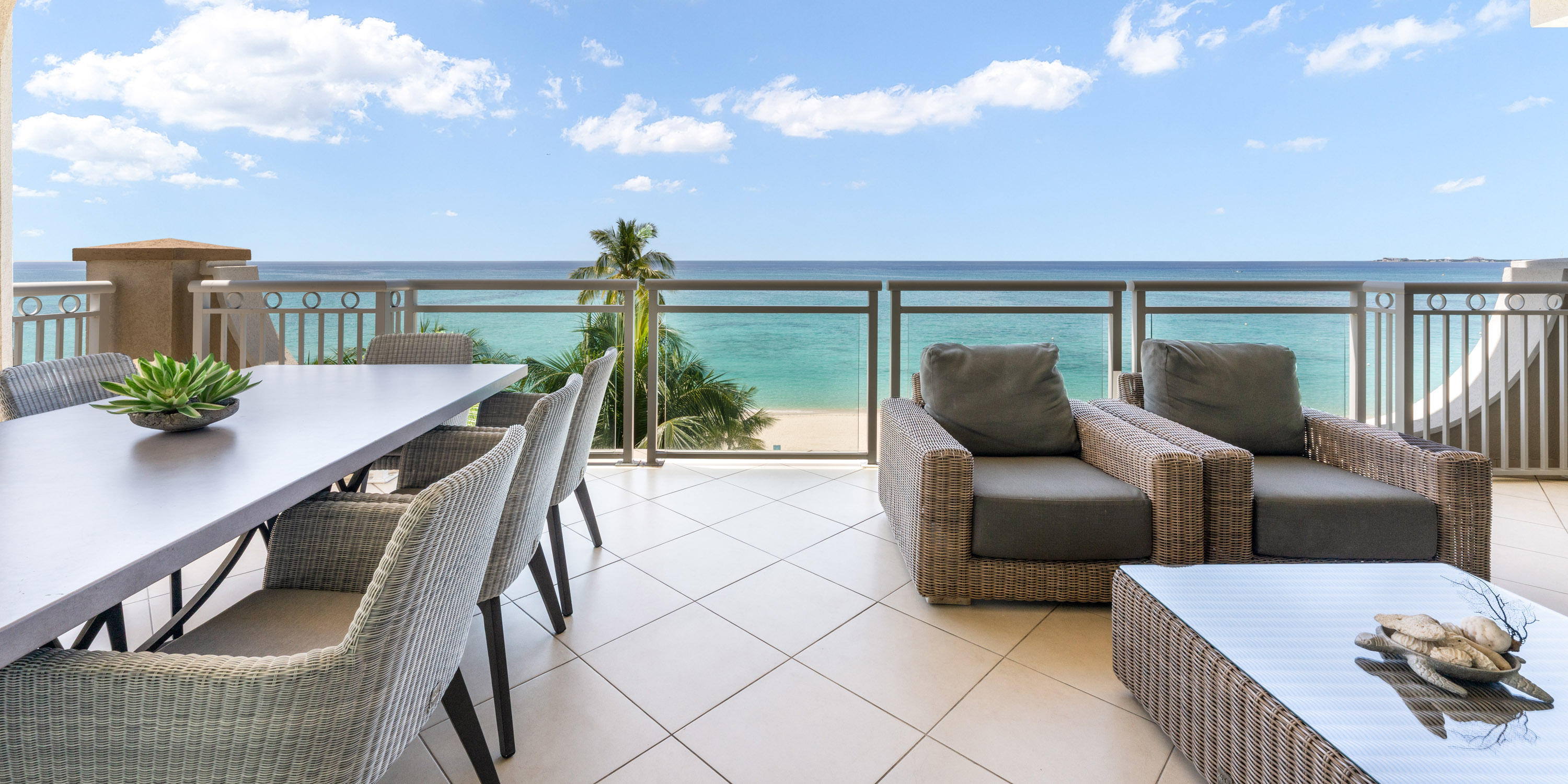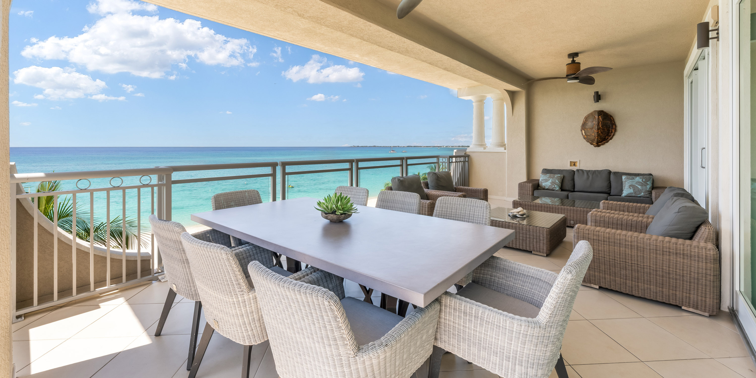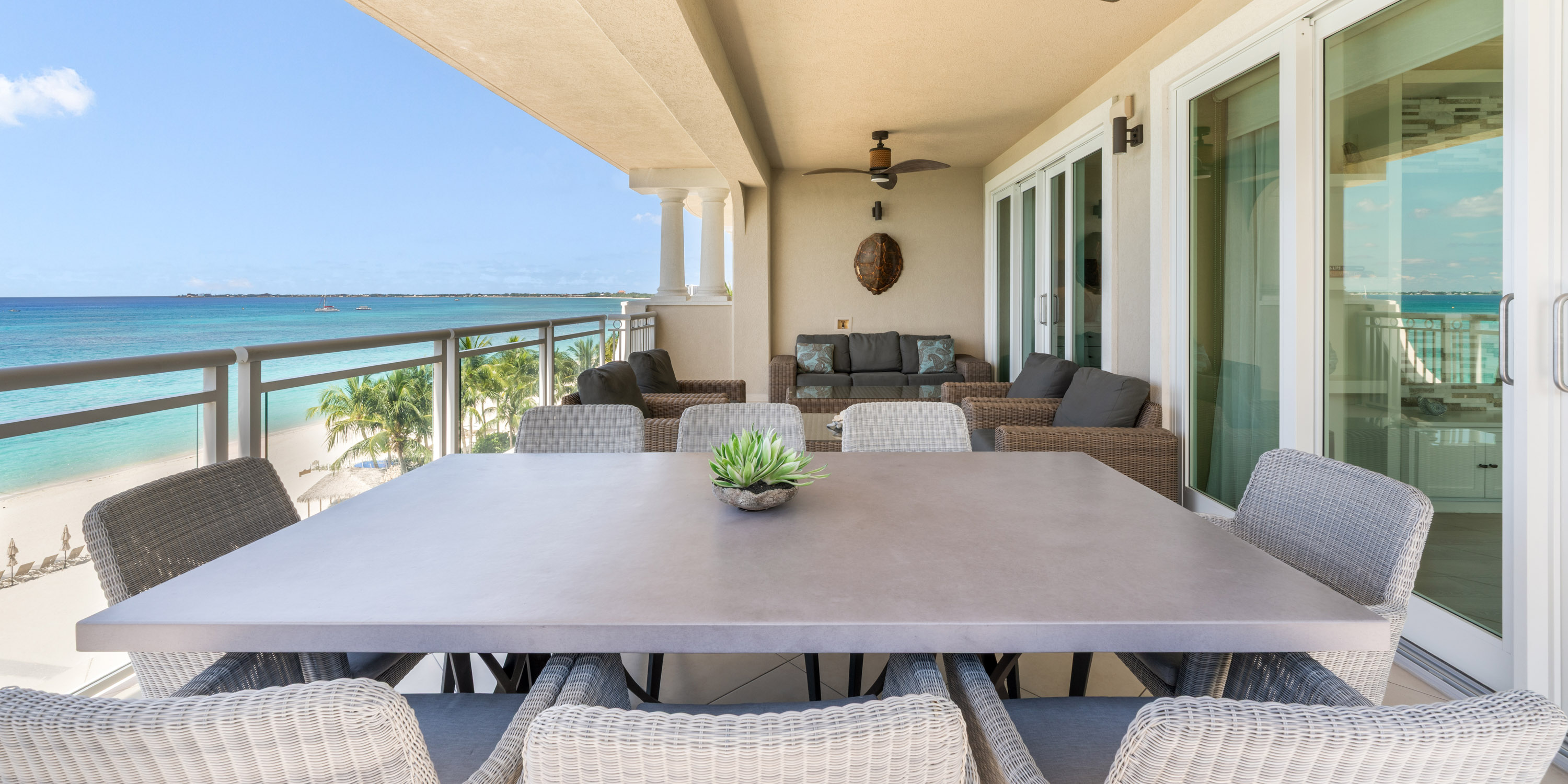 The large open patio is set up with comfortable seating for seaside dining or comfy relaxation overlooking Seven Mile Beach.