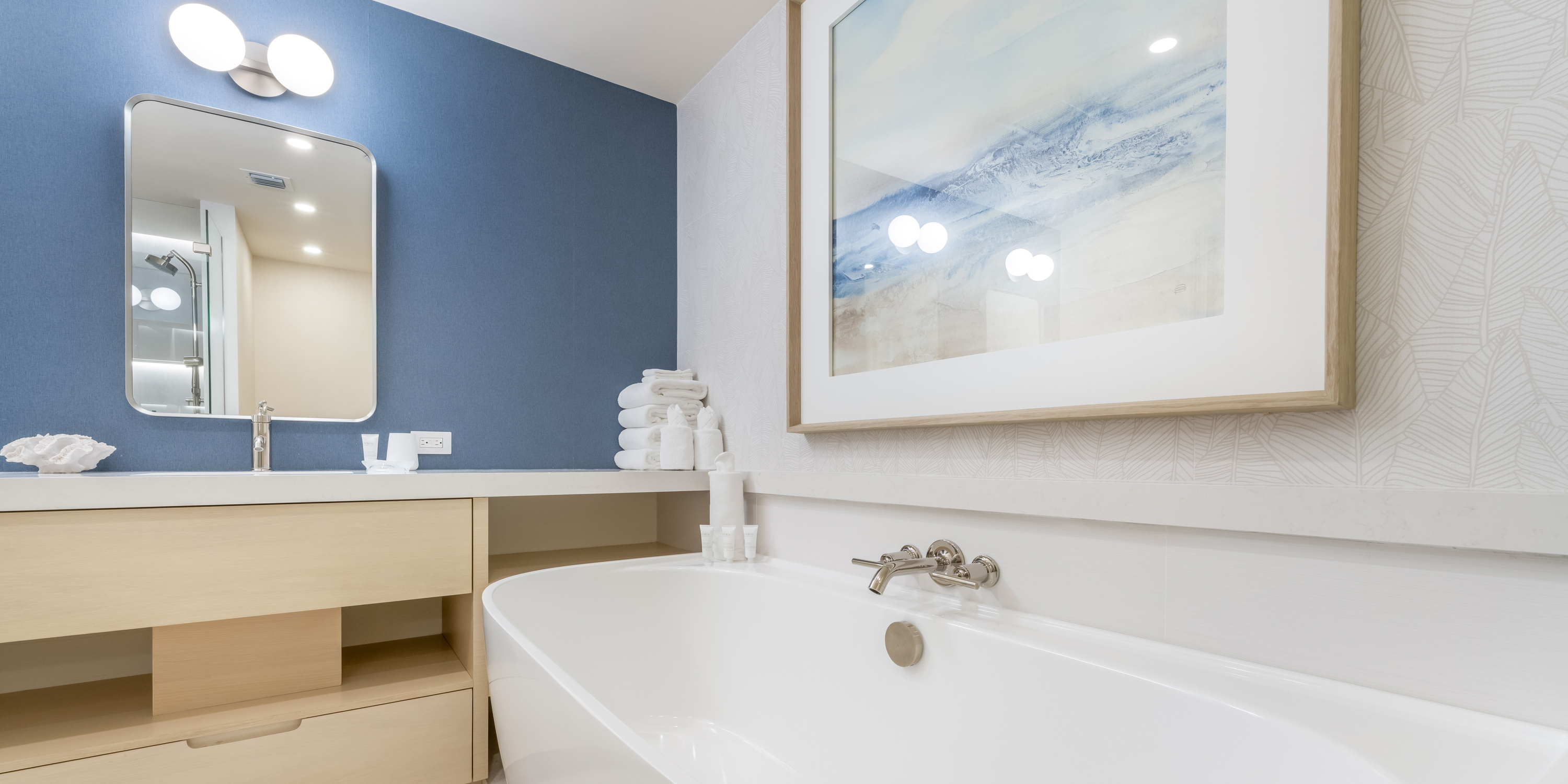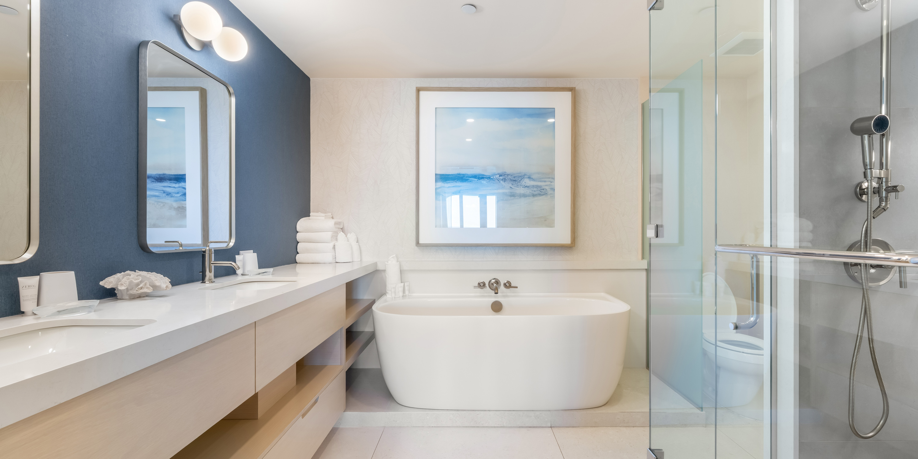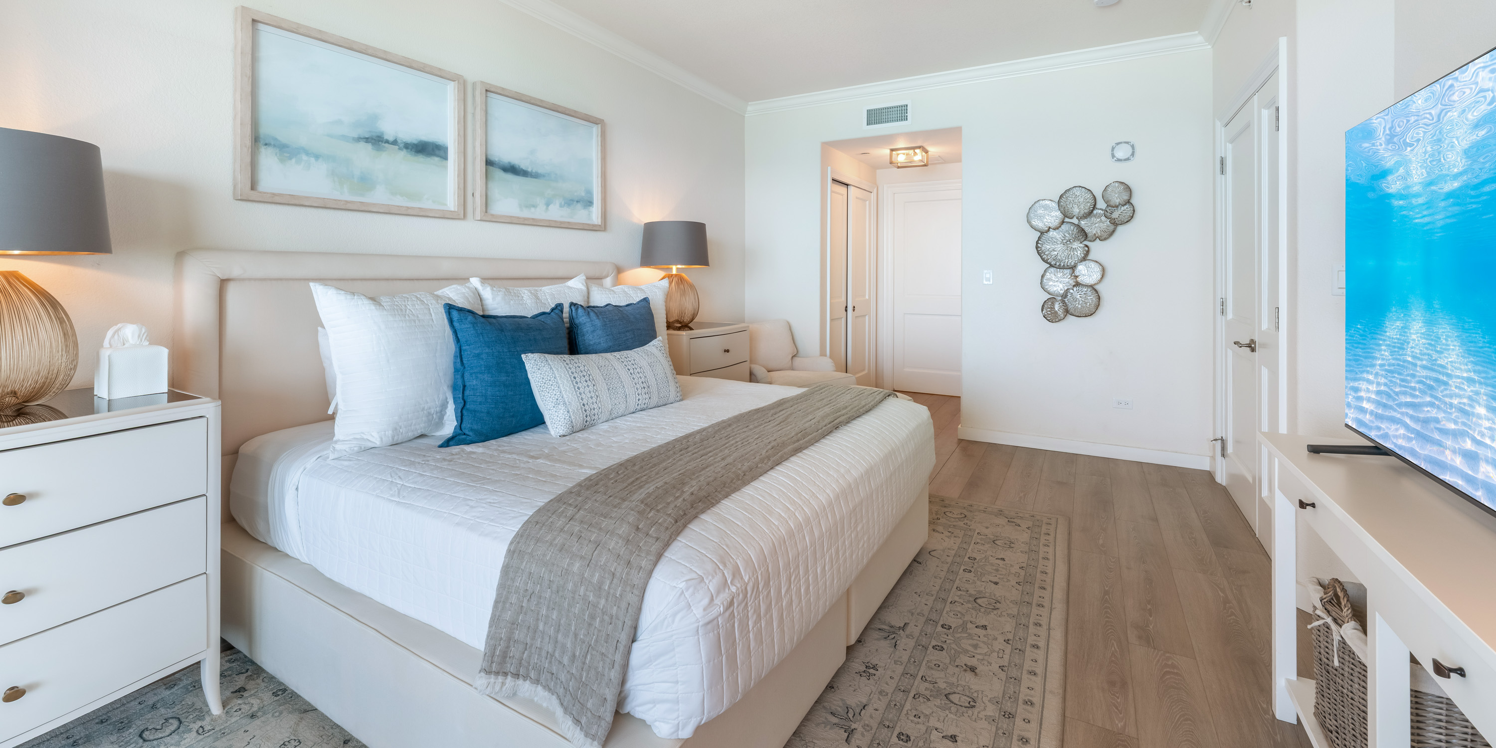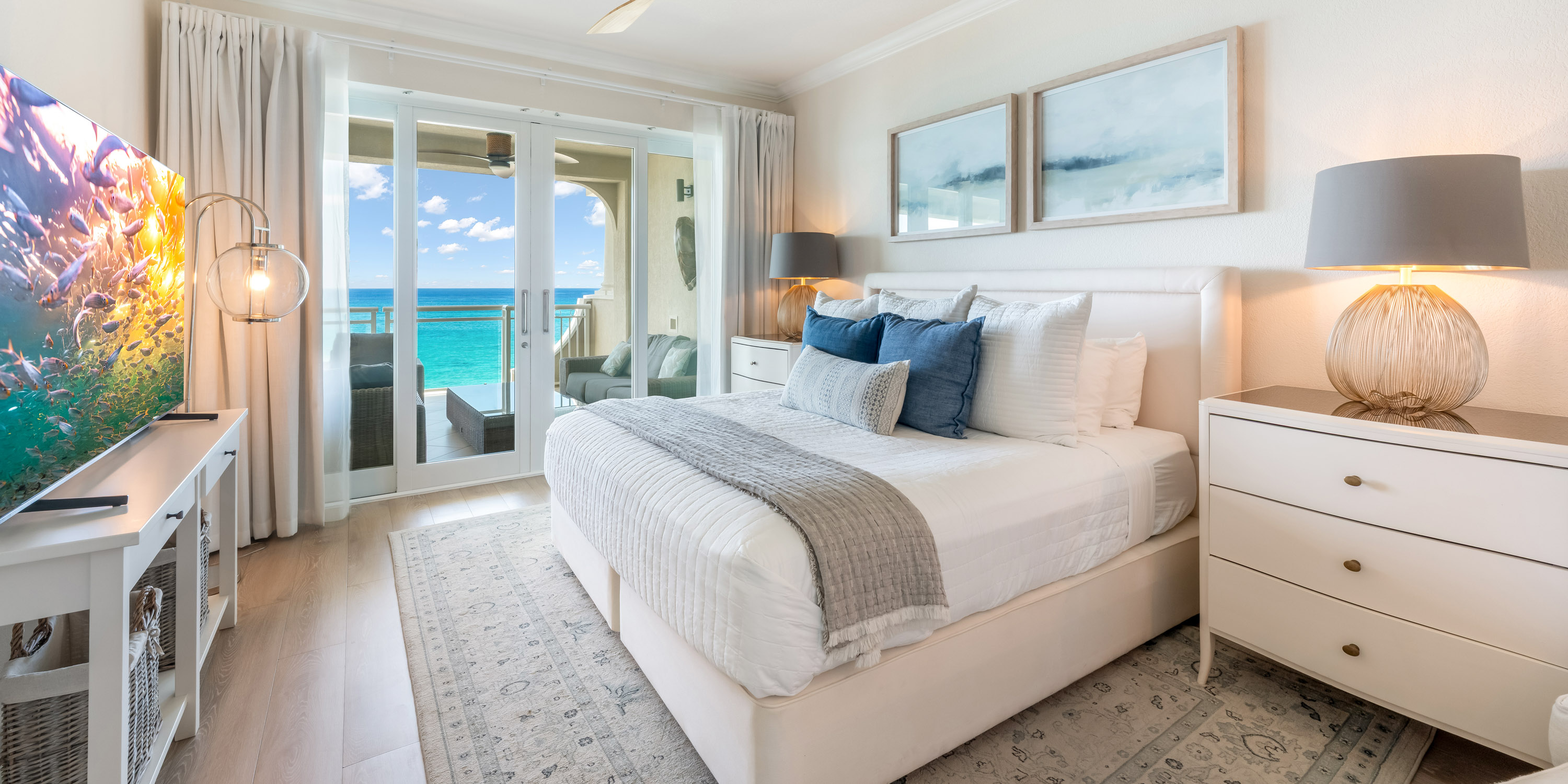 - Primary Suite - king bed, oceanfront, walk-out access to the balcony, television, ensuite with double vanity, soaking tub, and shower.