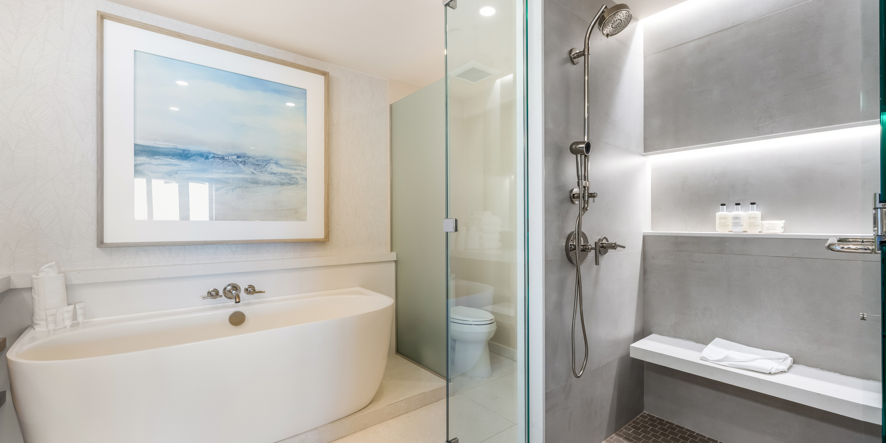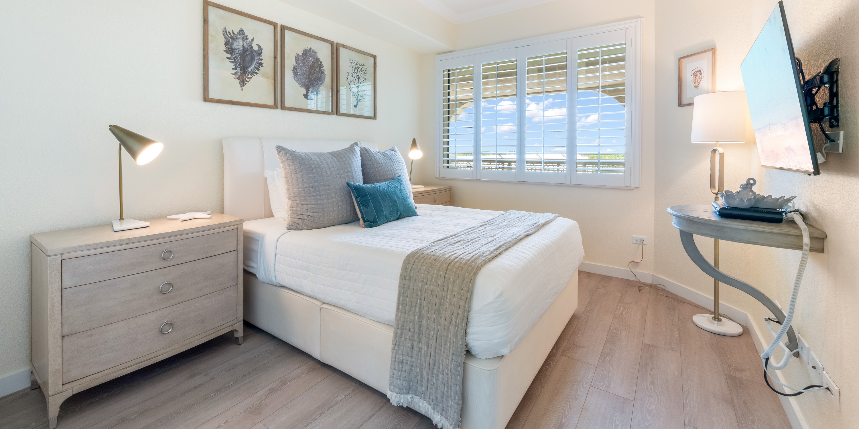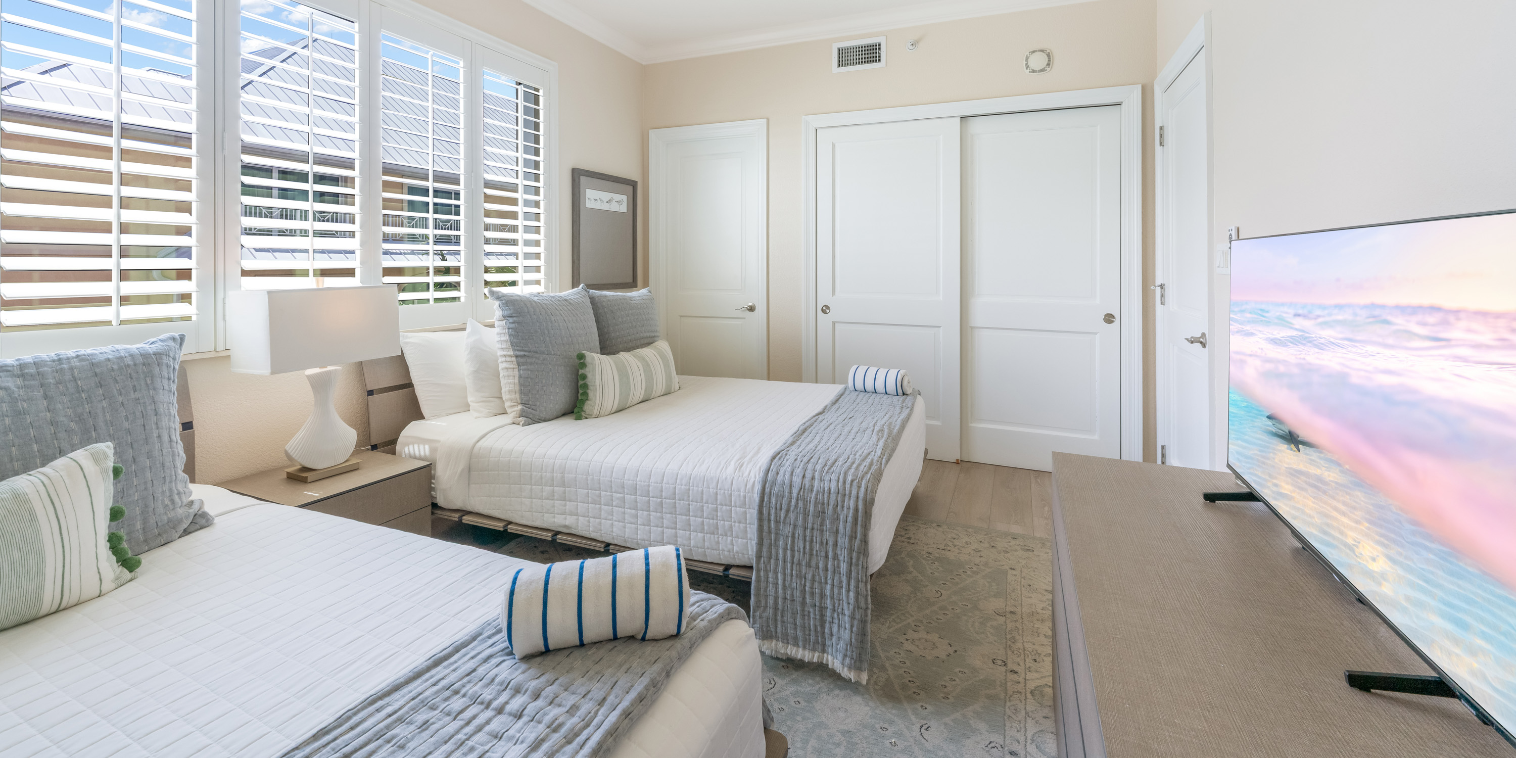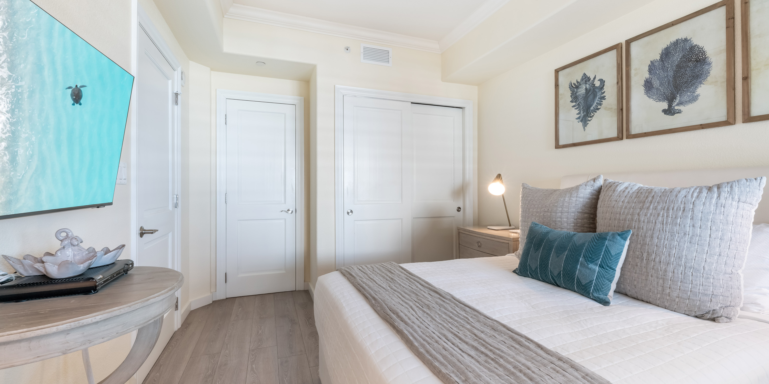 - Primary Suite - king bed, oceanfront, walk-out access to the balcony, television, ensuite with double vanity, soaking tub, and shower.