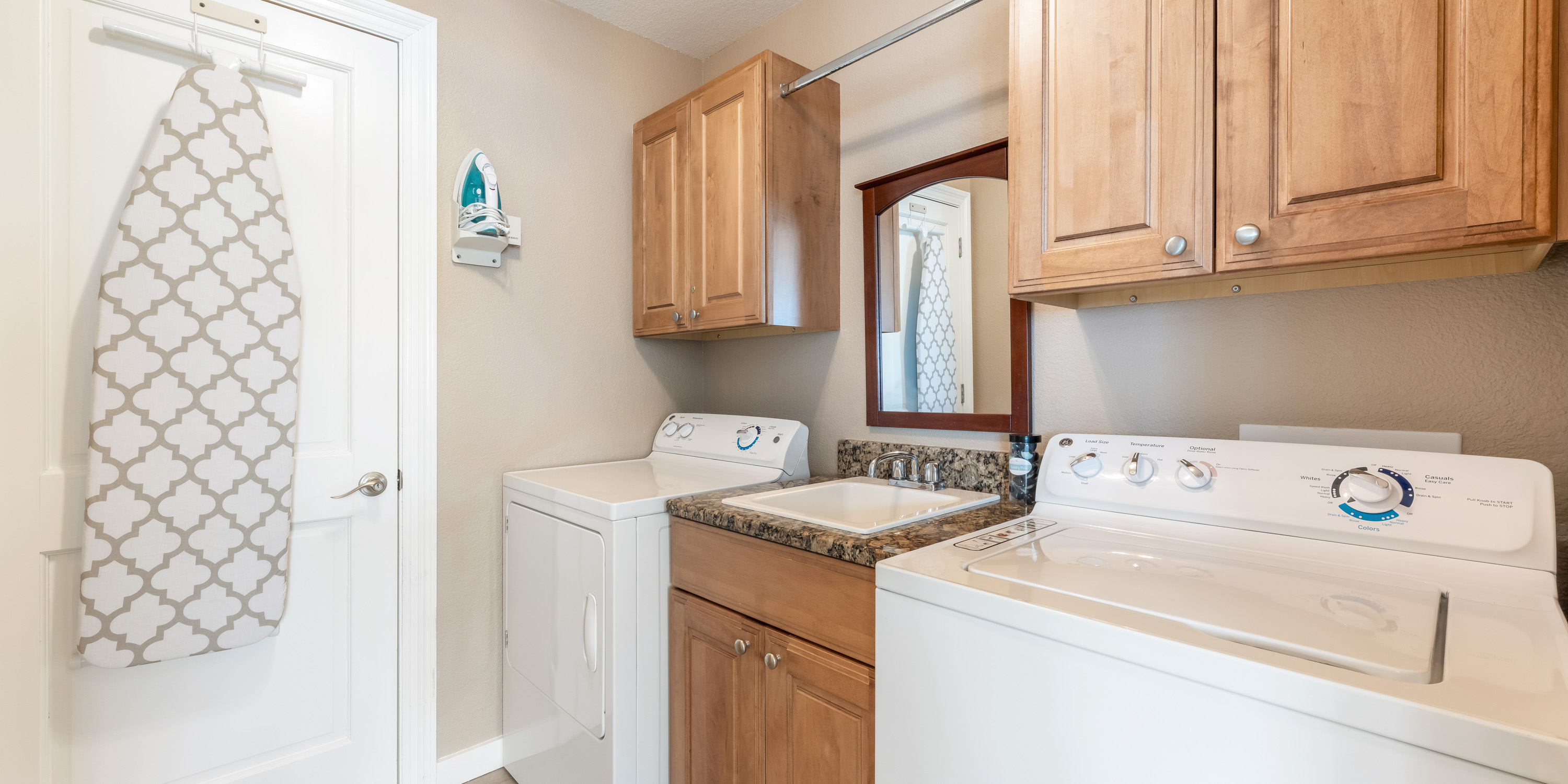 The in-unit laundry room features a full-size washer and dryer, a utility sink, plus extra linens, bath towels, and beach towels. An iron and board are also provided.