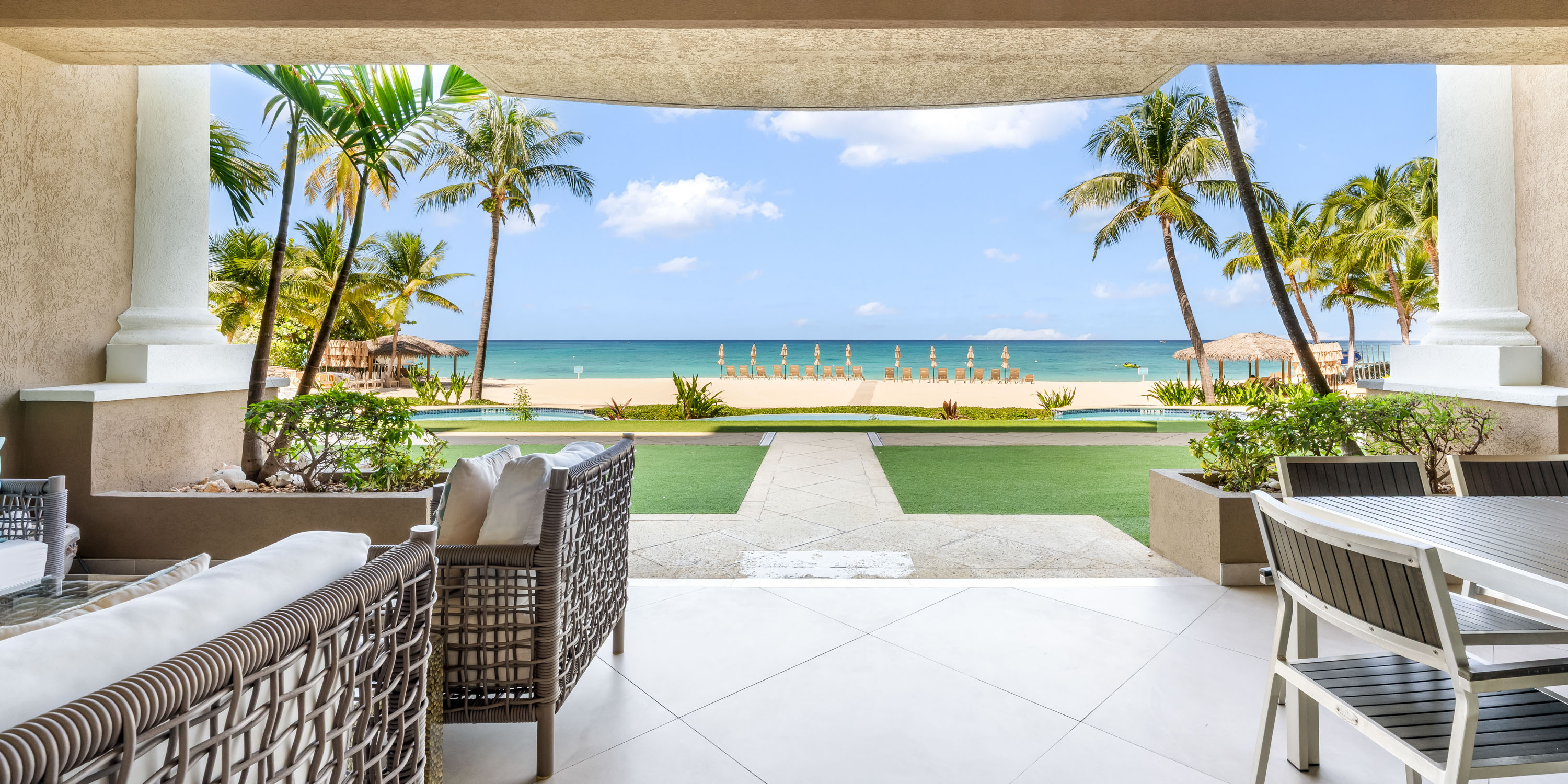 This luxury ground-floor condo offers direct walk-out access to the beach, pool deck, and BBQ areas from the spacious patio. Dine outdoors or just relax on your comfortable patio furniture while soaking in the beach views.