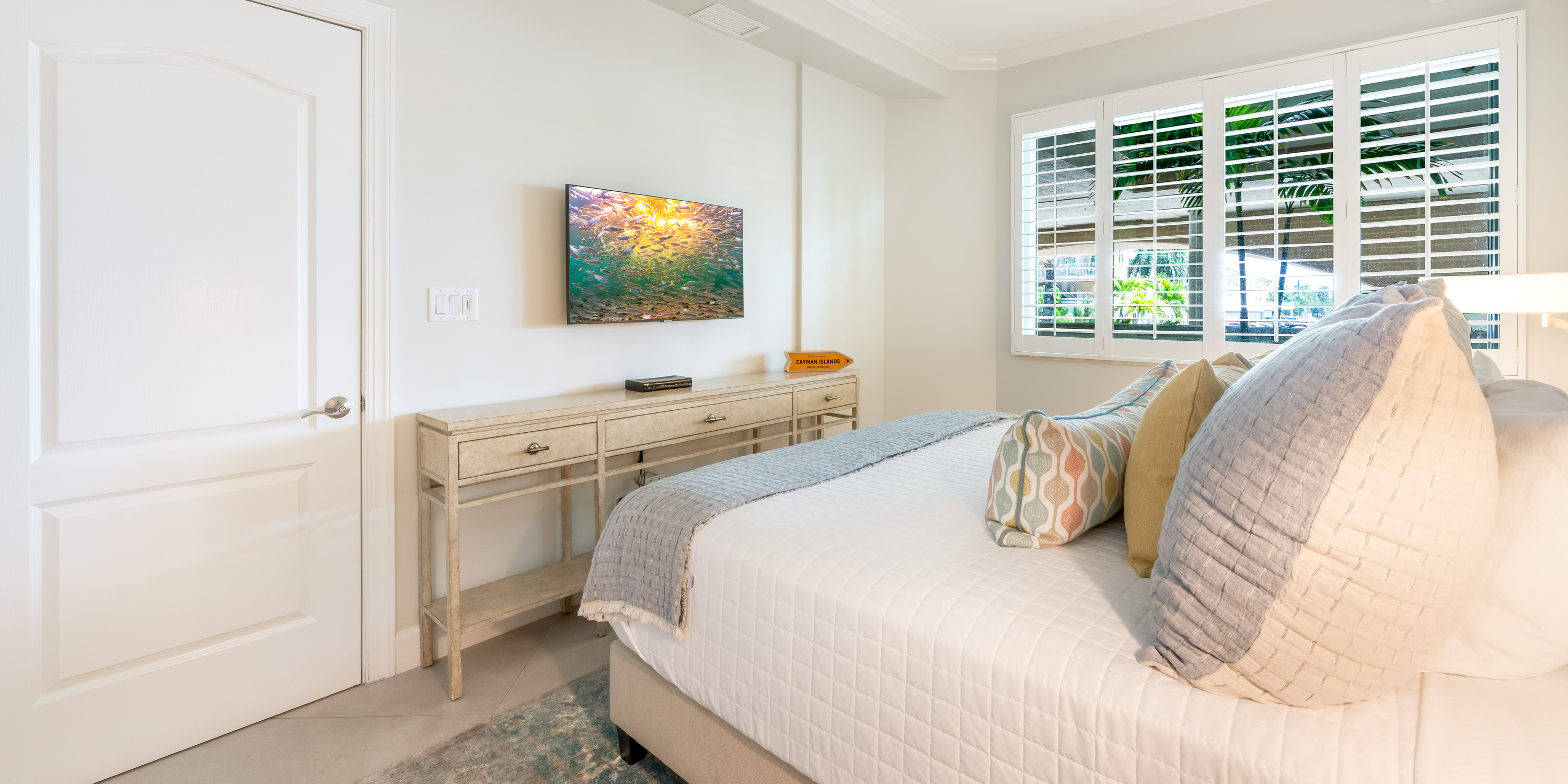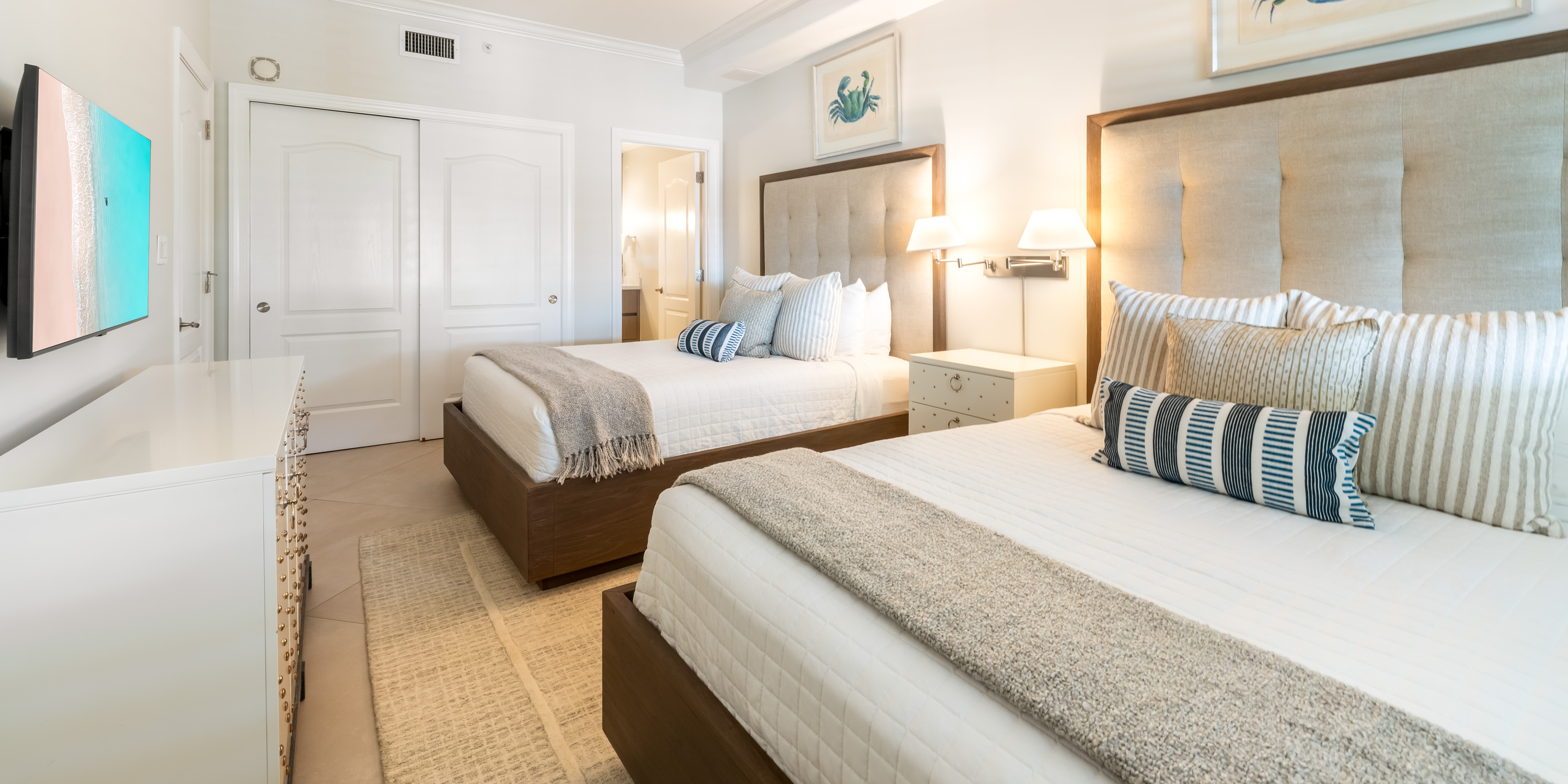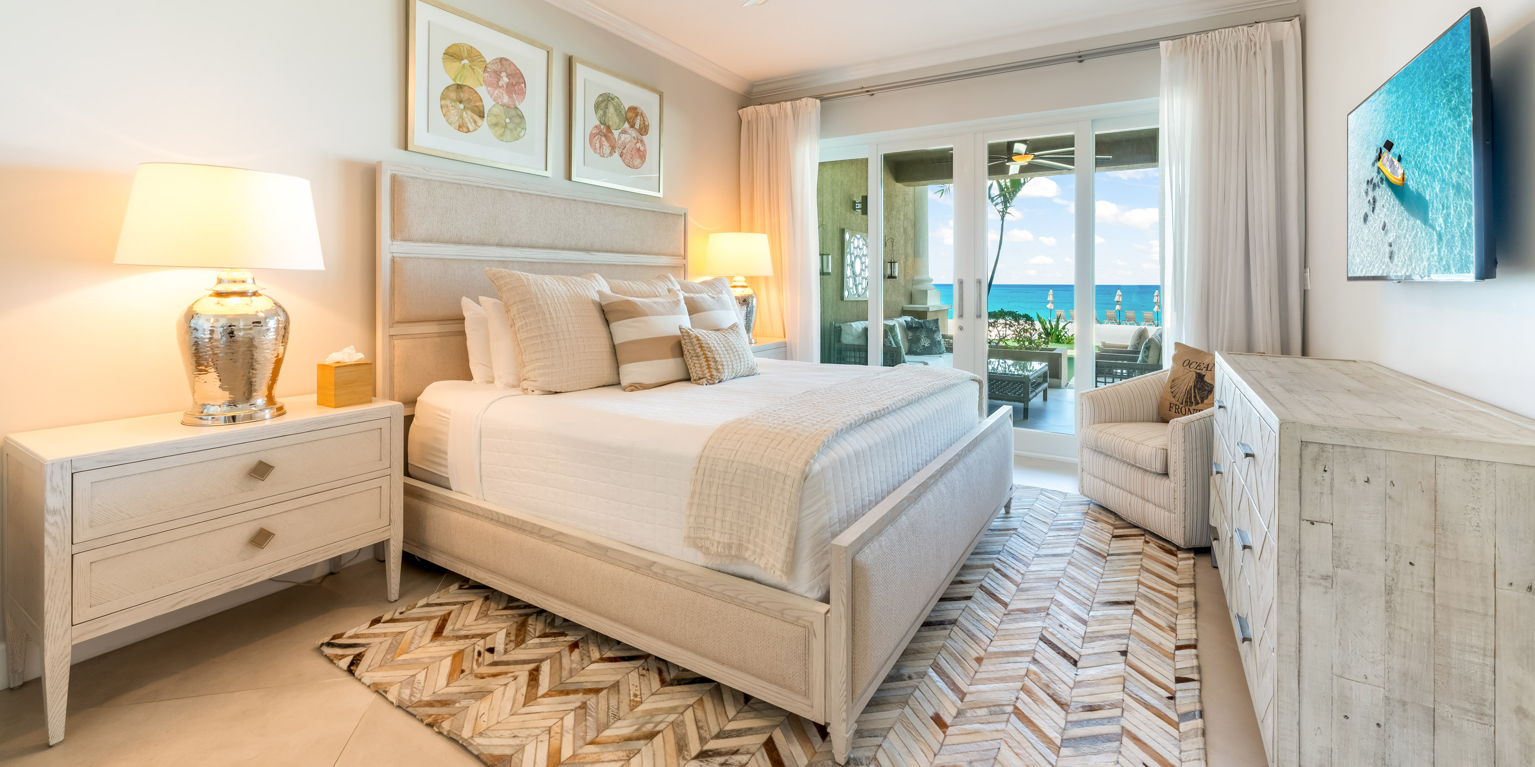 - Primary Suite - king bed, oceanfront, walk-out access to the patio, television, ensuite with double vanity, walk-in shower, and make-up vanity.