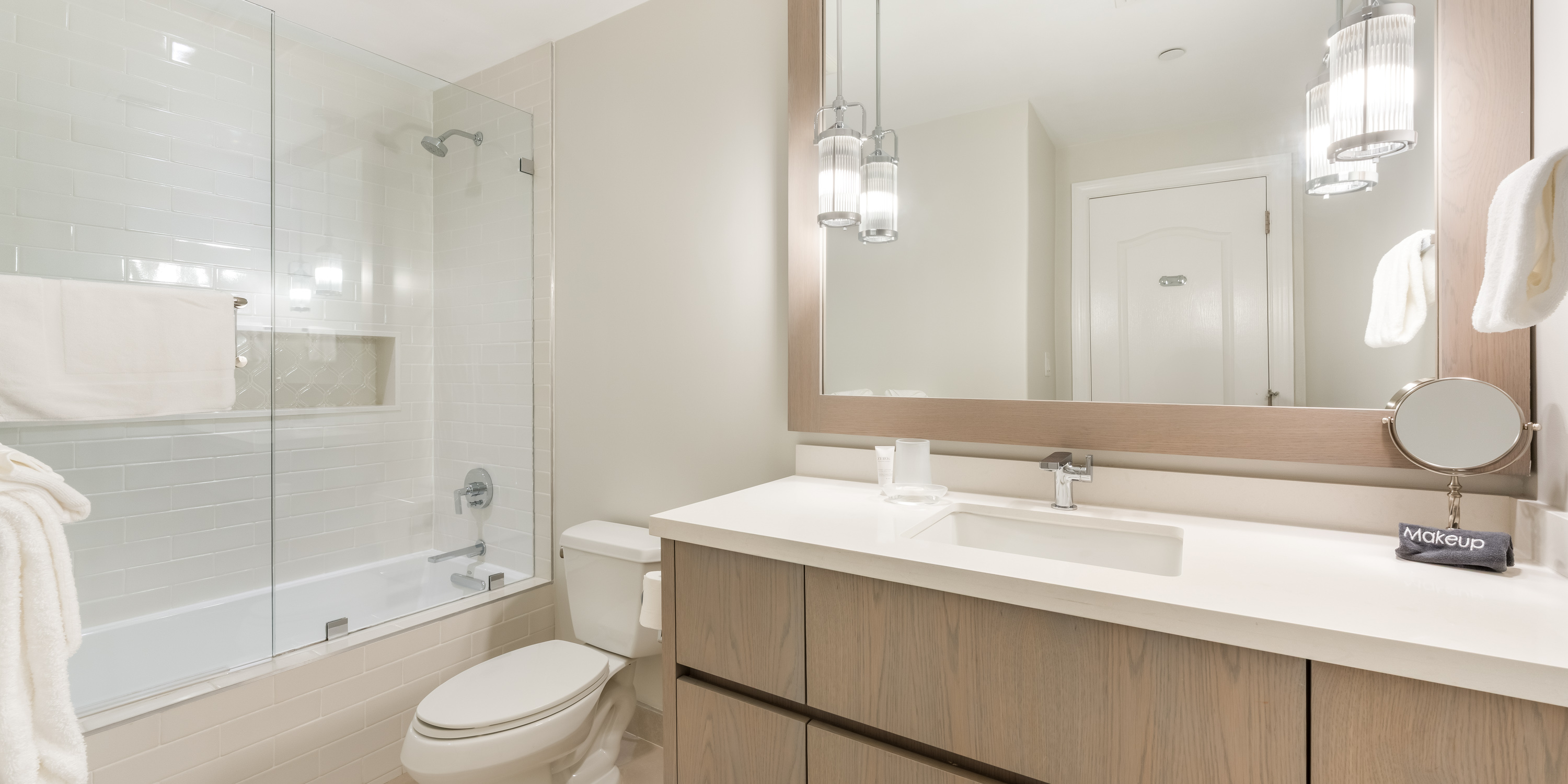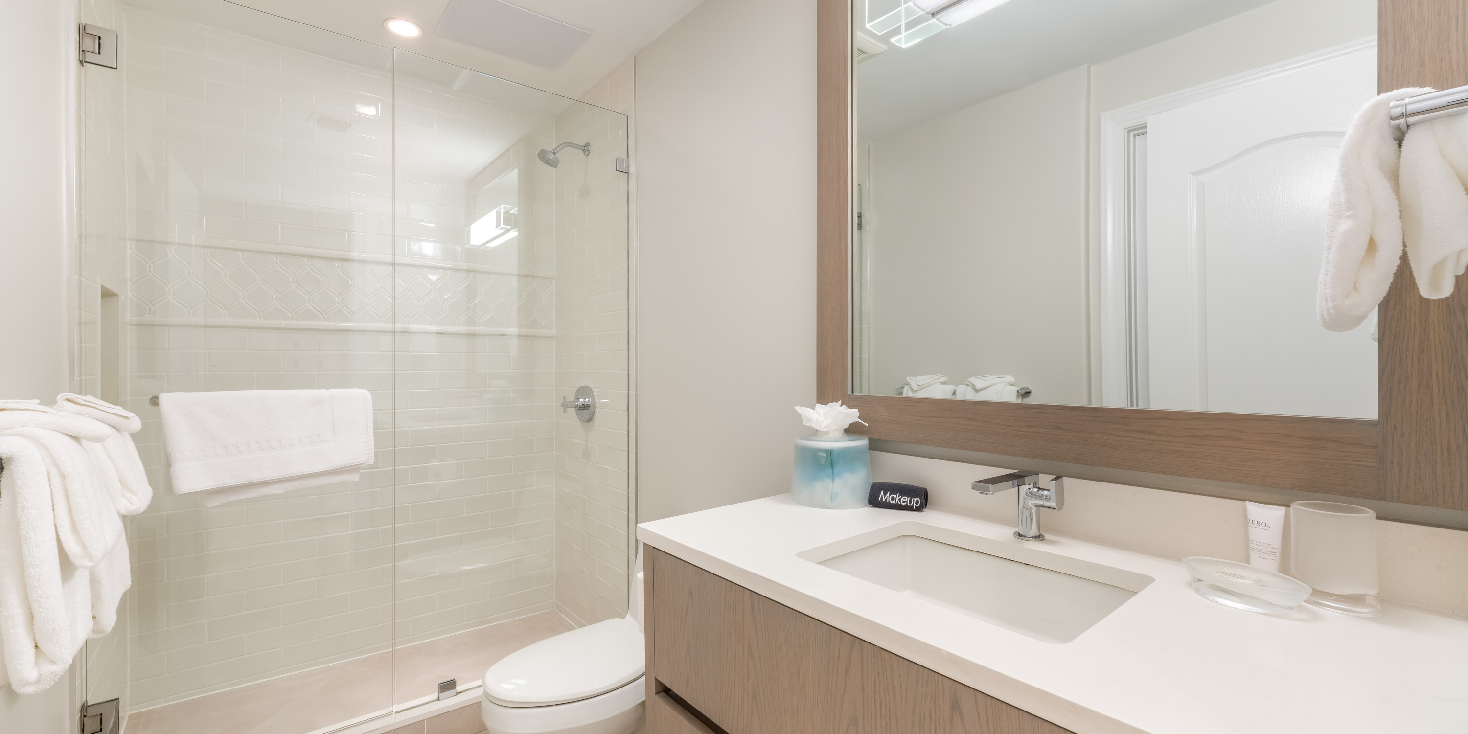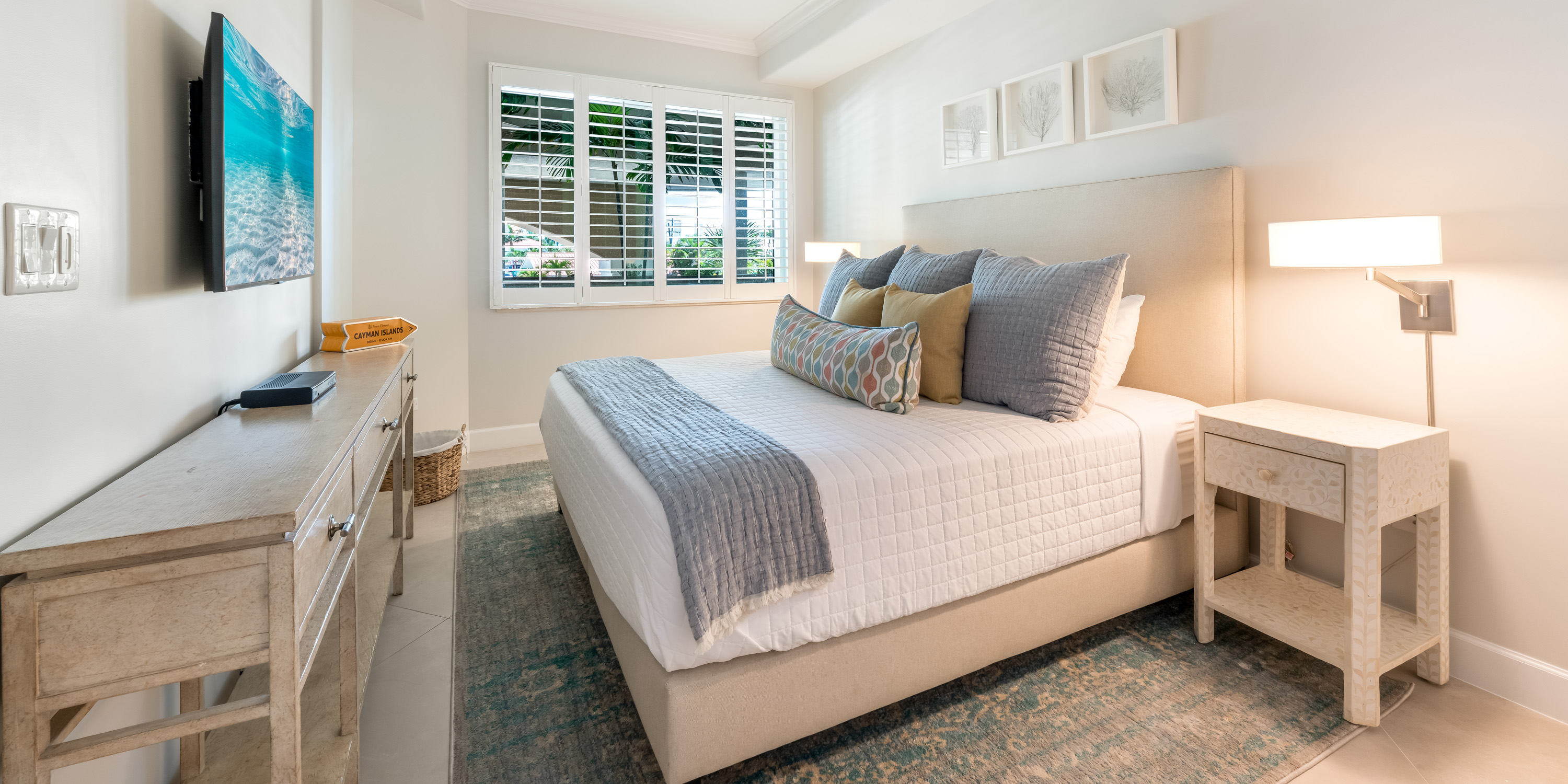 - Primary Suite - king bed, oceanfront, walk-out access to the patio, television, ensuite with double vanity, walk-in shower, and make-up vanity.