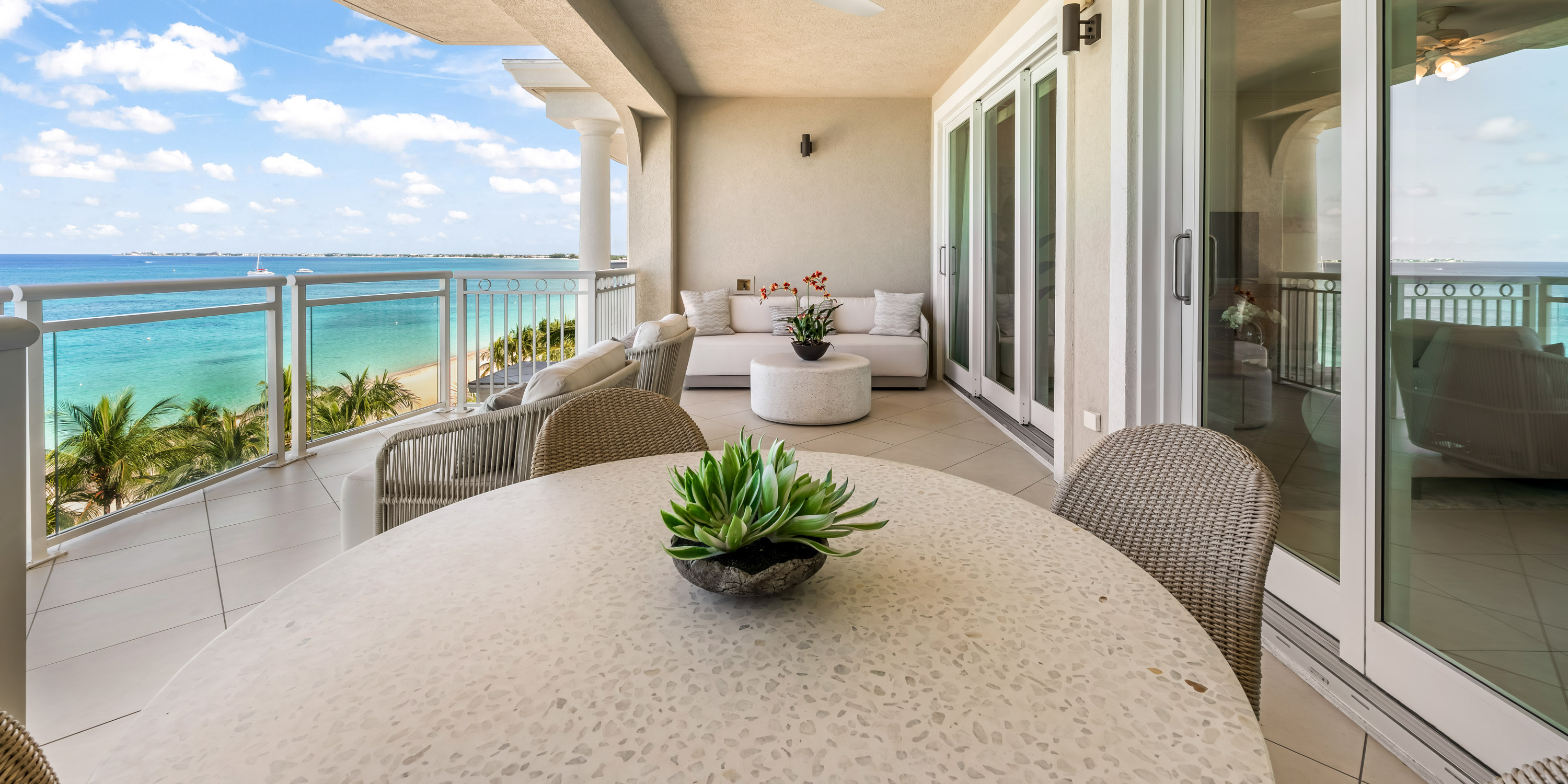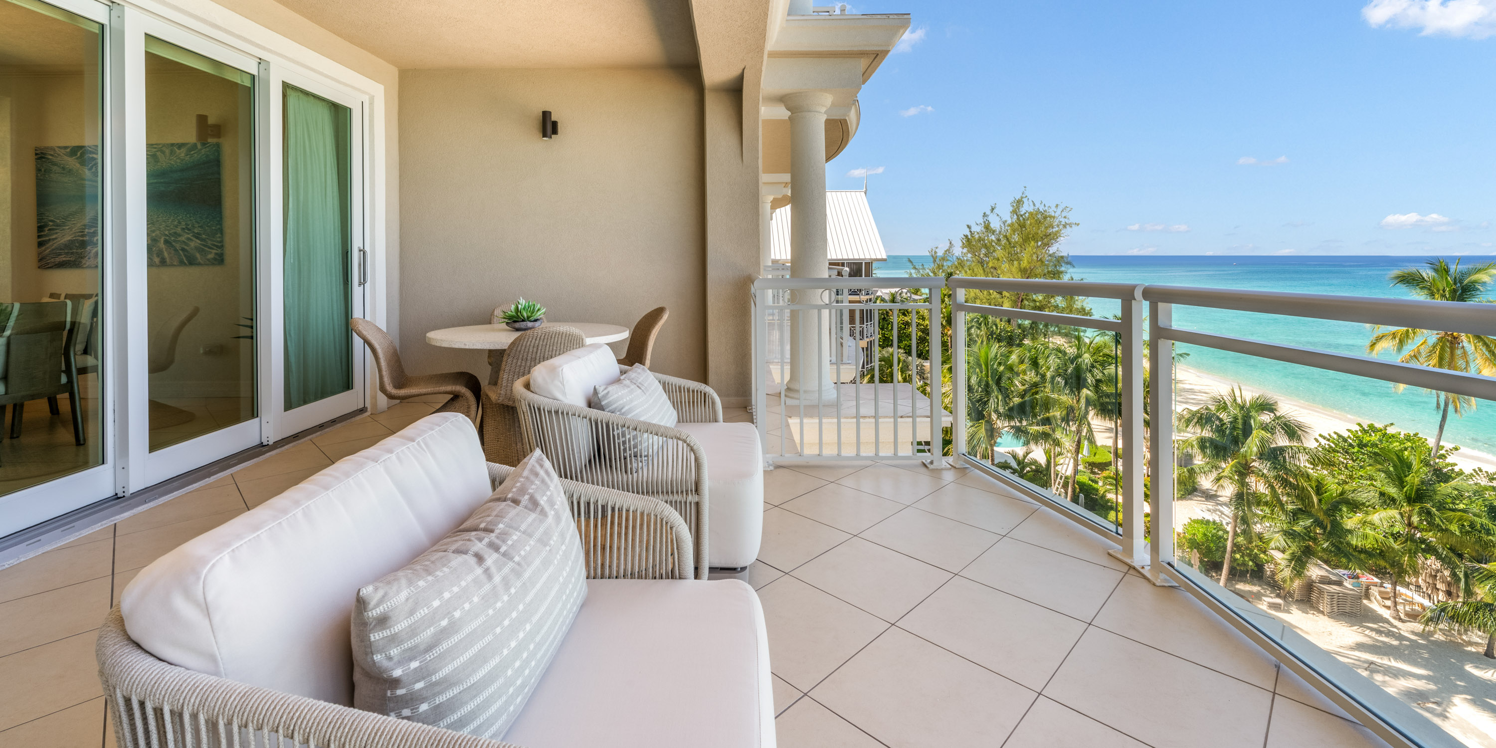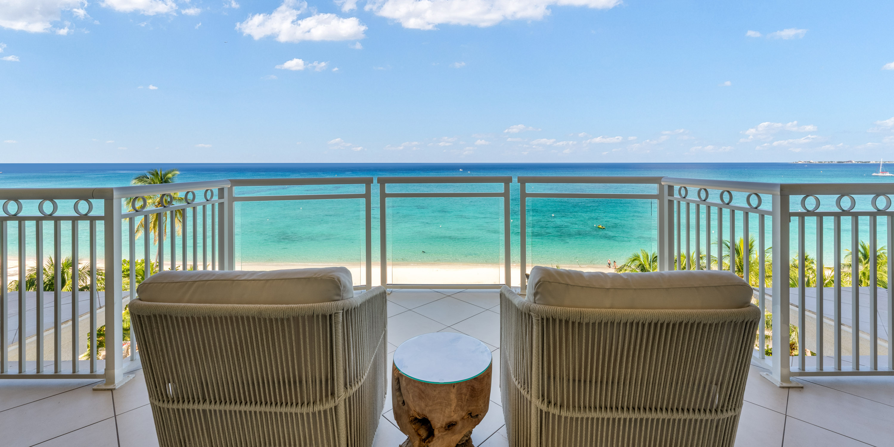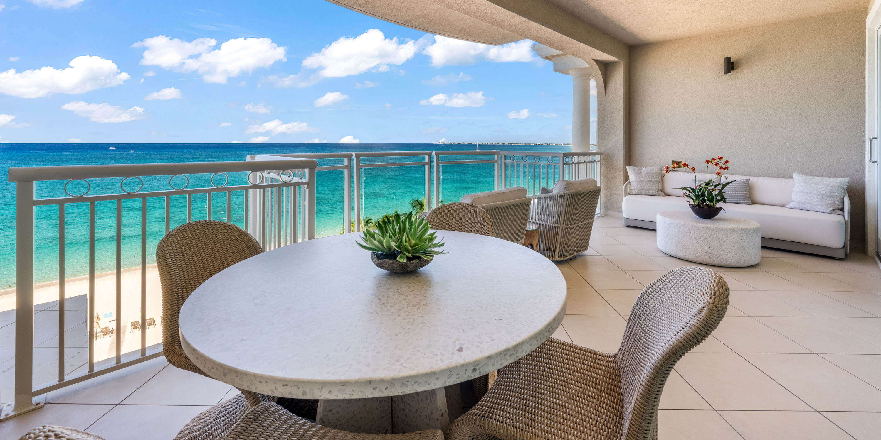 This 1,800 sq. ft. designer-decorated villa offers breathtaking views of Seven Mile Beach and the turquoise Caribbean Sea.