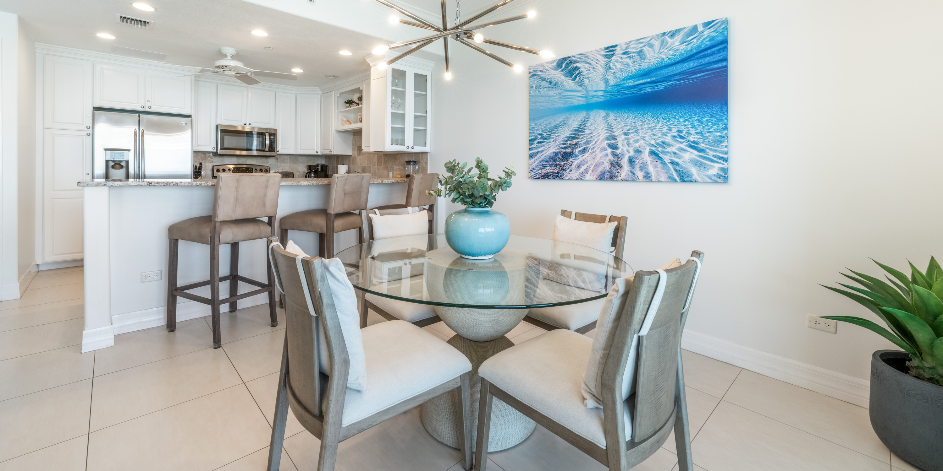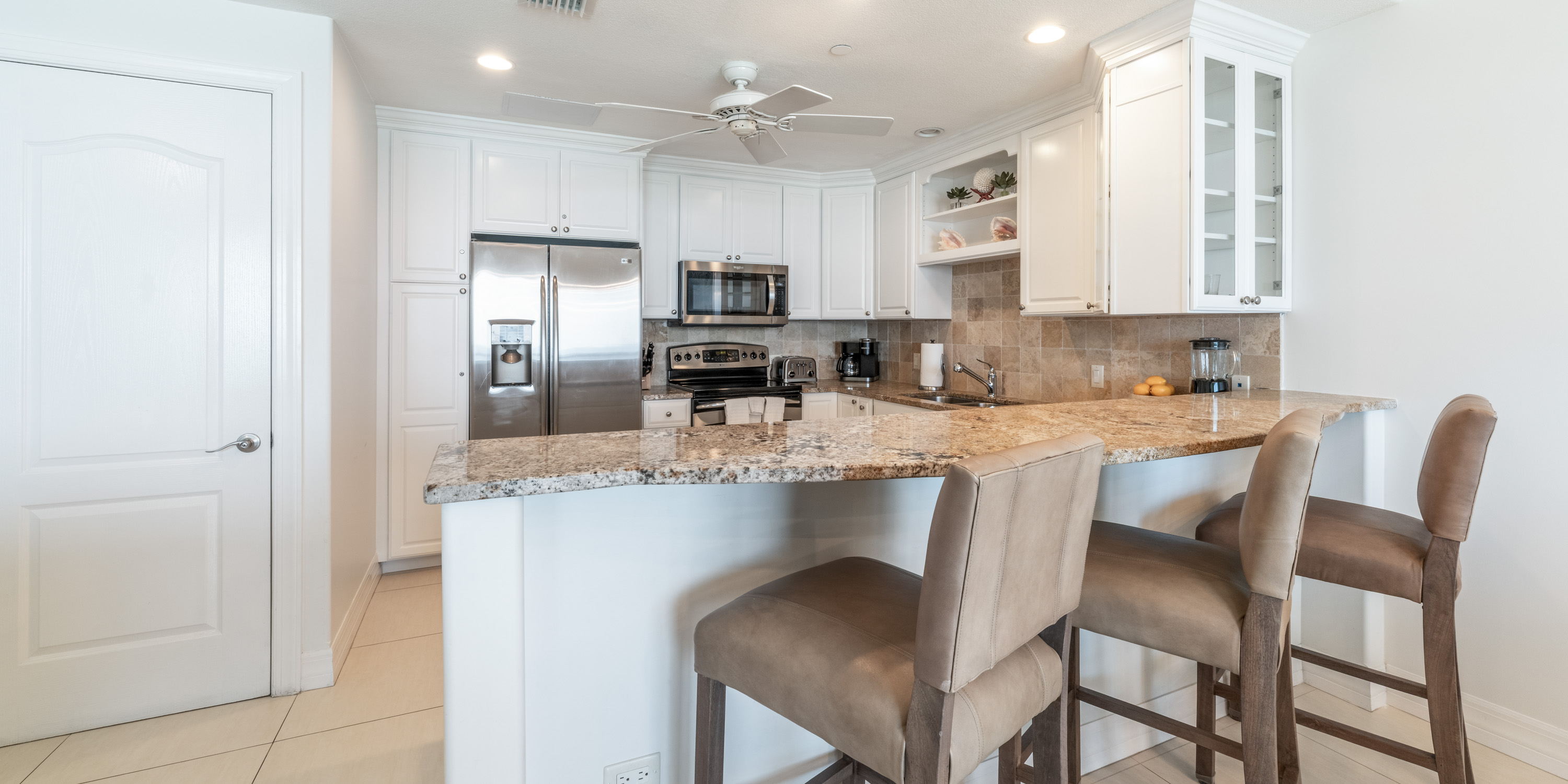 A fully equipped, high-end, gourmet kitchen with granite countertops and stainless steel appliances awaits our guests, making meal planning simple and easy.