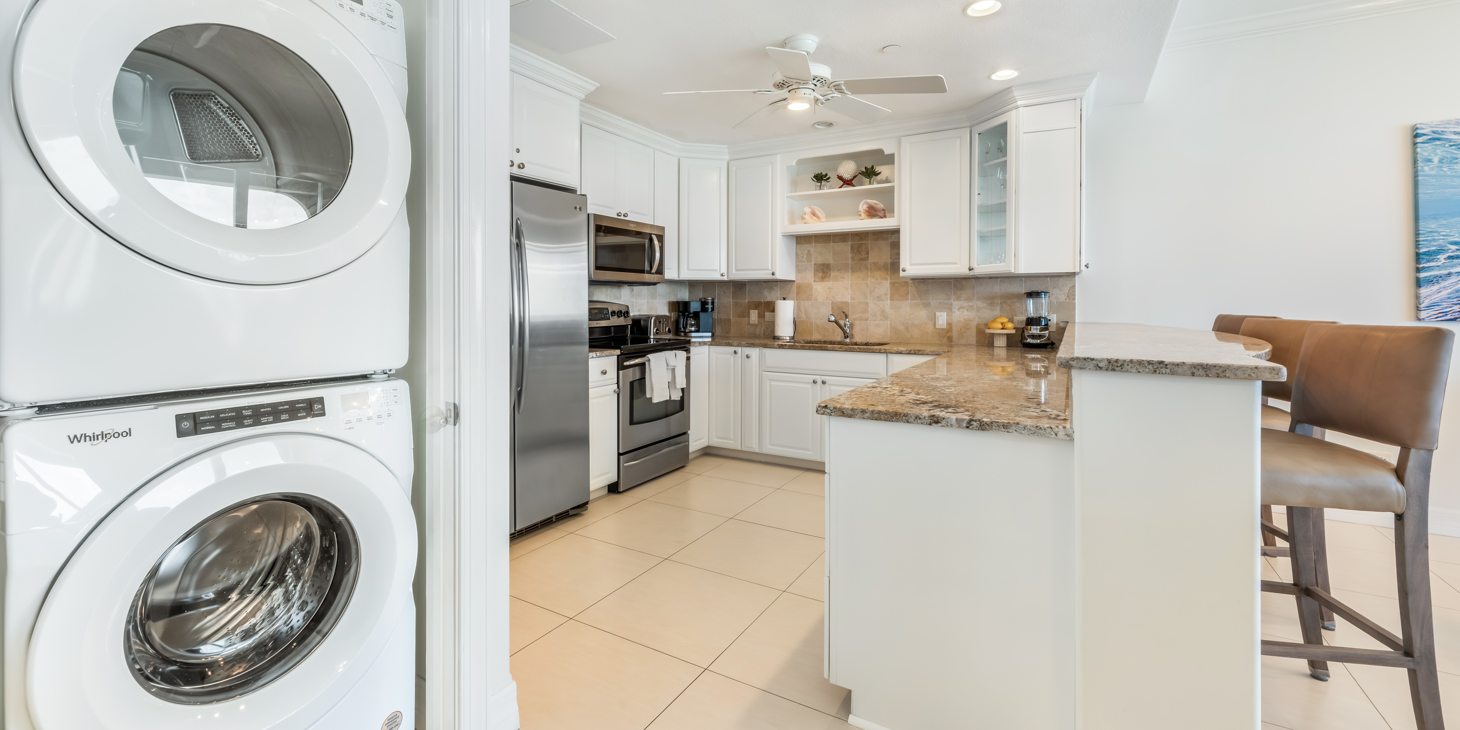 The in-unit laundry room features a full-size washer and dryer, laundry sink, plus extra linens, bath towels, and beach towels. An iron and board are also provided.